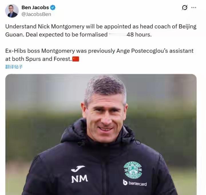 48小时内签约!蒙哥马利将出任北京国安主帅! 据足球记者记者Ben Jacobs报道,此前传得沸沸扬扬的尼克·蒙哥马利,这次将板上钉钉出任北京国安主帅了,预计正式协议将在48小时内签署。 蒙哥马利现年44岁,苏格兰人,此前曾担任名帅澳波在热刺和诺丁汉森林的助理教练。之前一度有消息说成都蓉城与北京国安争抢蒙哥马利,但是随着约翰·阿洛伊西确定出任成都蓉城新帅,蒙哥马利执教北京国安也没有了悬念,不出意外,北京国安很快就会官宣了。北京国安 国安主帅 成都蓉城主帅 成都蓉城