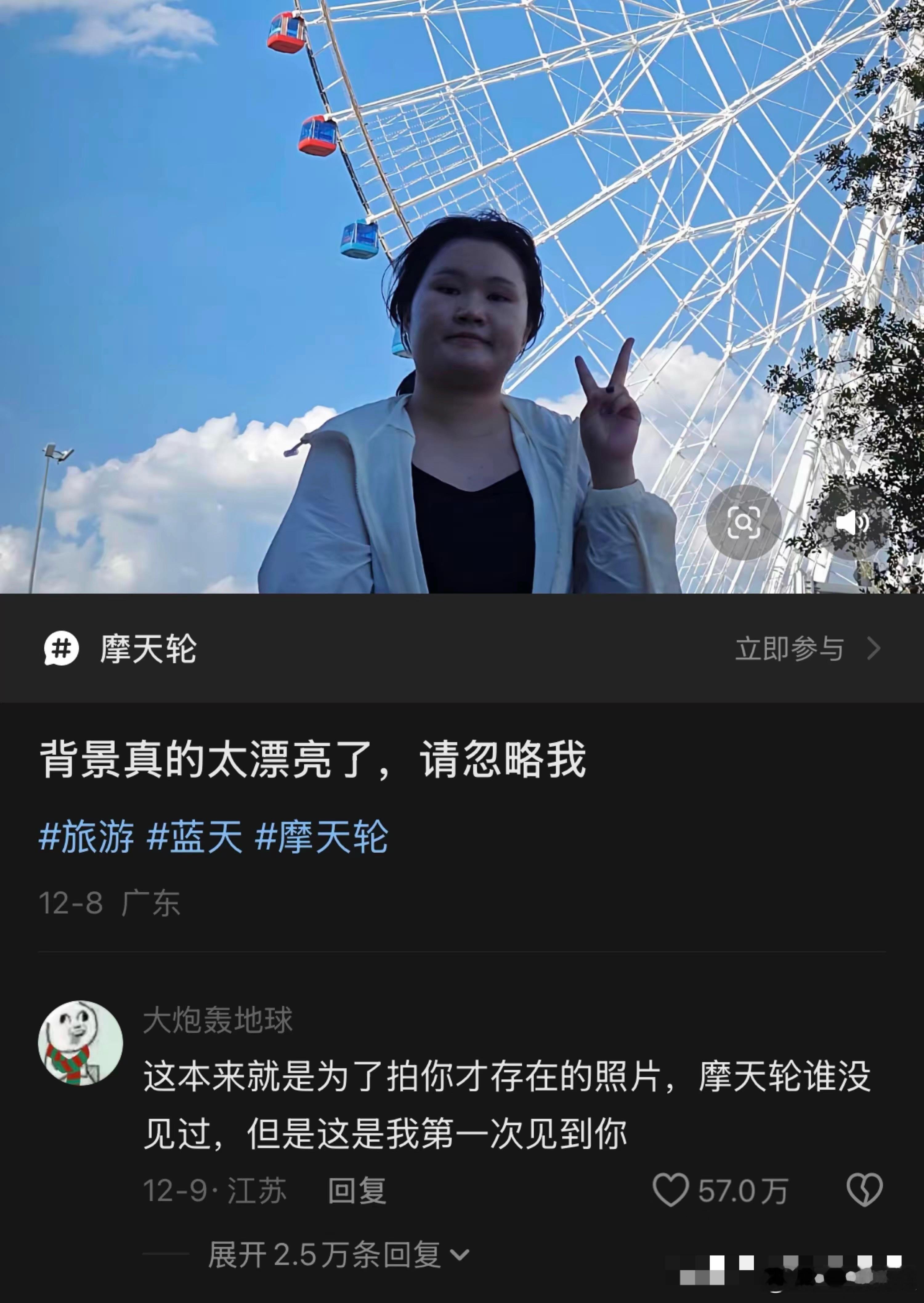 文字的力量到底能有多强大?起初是一个网友,发了一张自己和摩天轮的自拍照,可能是有点自卑吧,她配文说,“背景真的太漂亮了,请忽略我。”一个叫“大炮轰地球”的网友评论短短几个字,我相信在女孩未来的生活中犹如一盏灯照亮她前行的路。