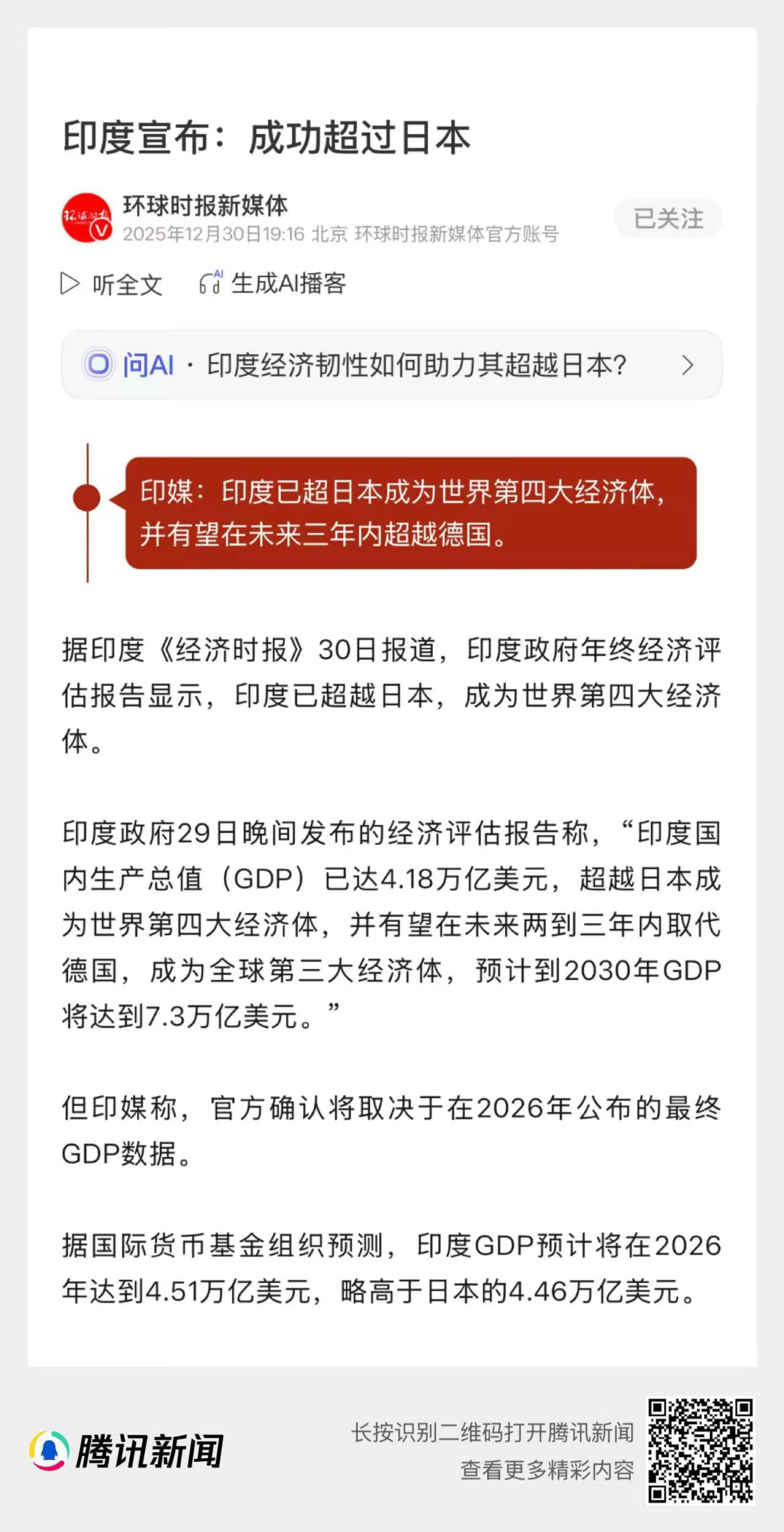 【印度宣布:成功超过日本】 (环球时报新媒体 2025年12月30日) 『 印媒:印度已超日本成为世界第四大经济体,并有望在未来三年内超越德国。 』 据印度《经济时报》30日报道,印度政府年终经济评估报告显示,印度已超越日本,成为世界第四大经济体。 印度政府29日晚间发布的经济评估报告称,“印度国内生产总值(GDP)已达4.18万亿美元,超越日本成为世界第四大经济体,并有望在未来两到三年内取代德国,成为全球第三大经济体,预计到2030年GDP将达到7.3万亿美元。” 但印媒称,官方确认将取决于在2026年公布的最终GDP数据。 据国际货币基金组织预测,印度GDP预计将在2026年达到4.51万亿美元,略高于日本的4.46万亿美元。 另据法新社报道,尽管华盛顿在8月份对印度购买俄罗斯石油征收巨额关税,引发了人们对于印度经济的担忧,但新德里仍对其经济前景持乐观态度。 印度表示,经济持续增长反映了其“在全球贸易持续不确定性下的韧性”。 印度宣布:成功超过日本