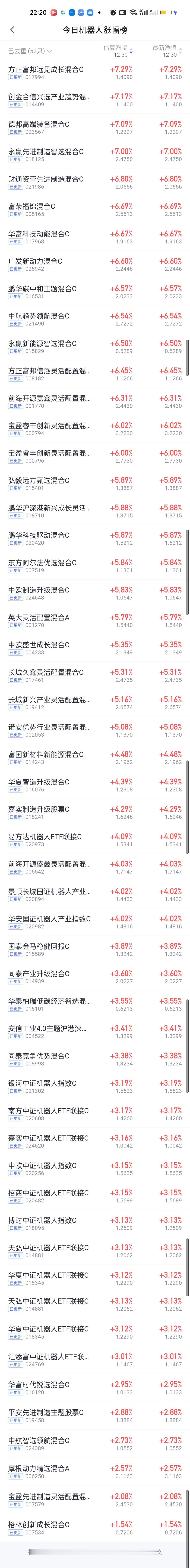 今日基金净值榜已全部更新完毕。涨幅榜前五收益率都在7%以上,也是今天仅有的收益率超过7%的五只基金。其中反正富邦远见成长7.29%排名第一,创金合信兴选产业趋势7.17%排名第二,中海魅力长三角7.12%排名第三,德邦高端装备7.09%排名第四,永赢先进制造7%排名第五。 跌幅榜方面,国投瑞银白银期货5.54%排名第一,中加优势企业2.98%排名第二,诺安研究精选股票2.36%排名第三,金信景气优选2.35%排名第四,招商沪深300地产等权重2.31%排名第五。 机器人,创新药,CPO,半导体涨幅榜一并奉上!