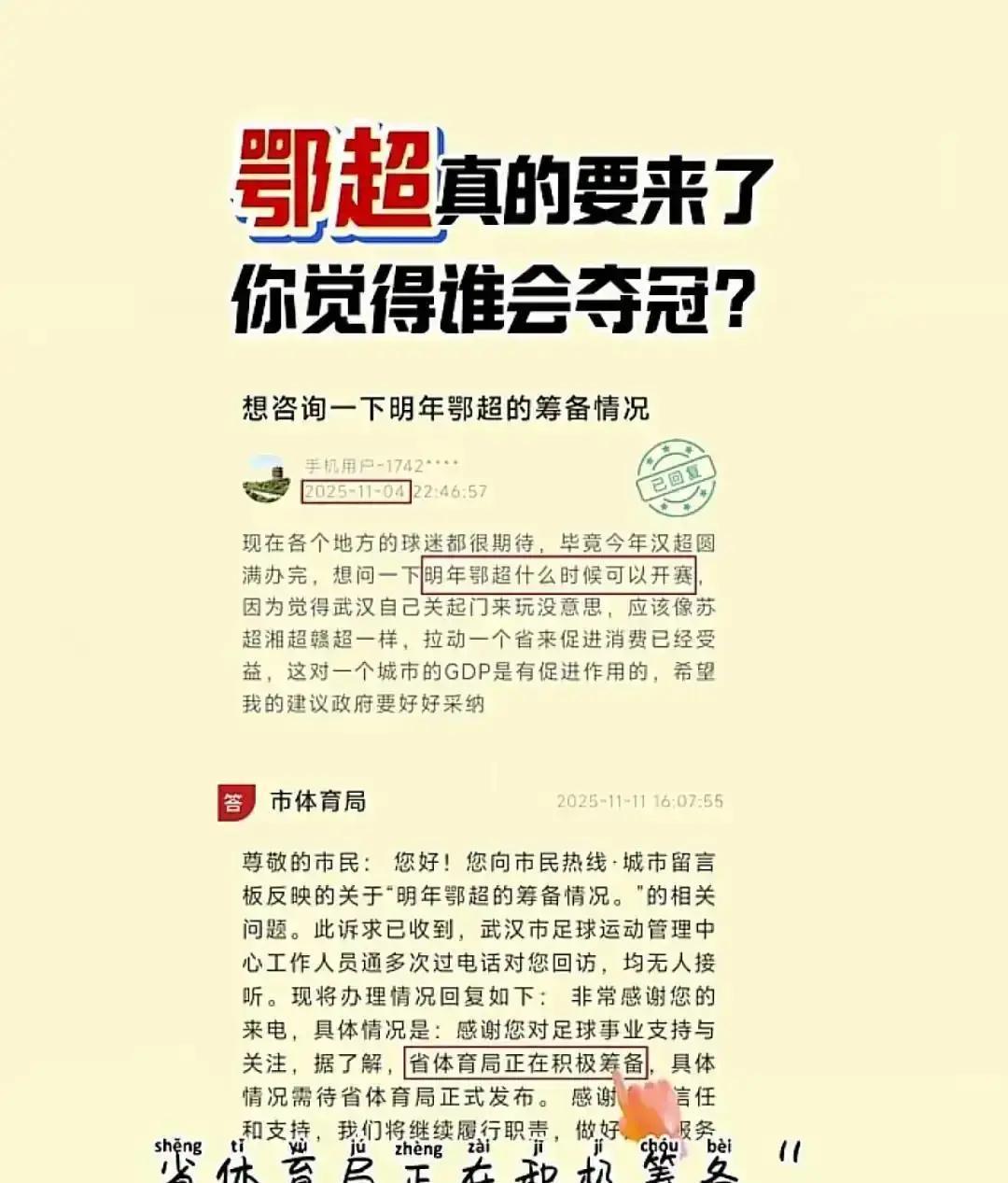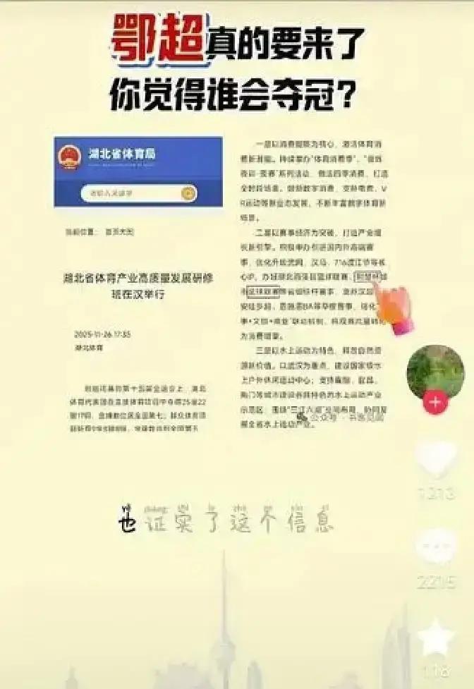 鄂超10月开踢,门票白送 三国球场、编钟奖杯,看球像穿越。8城球队,武汉襄阳死磕。直播抖音+湖北广电,3000万人盯着。 女足青训教练空降,业余队也能学职业套路。500名大学生志愿者边打工边学新媒体,毕业直接上岗。 50亿次曝光只是起点。2025九江岳阳来踢客场,长江中游城市一起卷。球赛变旅游,酒店机票全涨价。 你家门口的球队,可能下一场就赢钱。