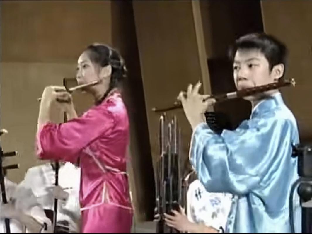 岁的孙楚泊与同学一块登台演奏笛子的照片。