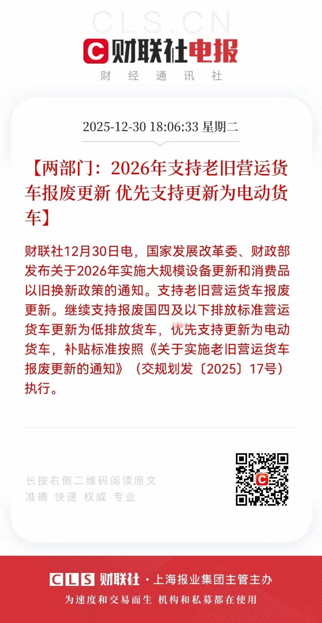 利好!大利好来了!汽车相关补贴迎来政策大利好!国家发改委、财政部发布2026年汽车报废更新与置换更新政策。明日汽车产业板块又要起飞了。。。。。2025年12月30日,国家发改委、财政部发布2026年汽车报废更新与置换更新政策,从商用车和乘用车两大维度为汽车消费市场注入新动力,政策红利将直接撬动汽车产业的更新需求。在商用车领域,政策聚焦老旧营运货车报废更新,明确继续支持国四及以下排放标准货车换为低排放车型,且优先支持更新为电动货车,补贴标准按此前发布的专项通知执行。这一举措将加速货运领域的新能源化转型,不仅能推动电动货车的市场渗透率提升,也会带动动力电池、电机电控等商用车核心零部件的需求增长,物流运输的绿色化升级步伐将进一步加快。乘用车方面,报废与置换更新均有明确的补贴细则。个人消费者报废自有乘用车后,购买新能源车型可获车价12%补贴(最高2万元),2.0升及以下燃油车补贴10%(最高1.5万元);置换更新的补贴力度稍降,新能源与燃油车分别补贴8%和6%,也设置了最高补贴上限。差异化的补贴政策精准瞄准了乘用车消费市场,既鼓励消费者选择新能源车型,也兼顾了燃油车的更新需求,有望直接拉动乘用车终端销量,尤其是中低端新能源车型的市场表现将更值得期待。整体来看,此次政策从商乘两端发力,既推动商用车的新能源转型,又撬动乘用车的消费需求,汽车产业链上下游都将迎来新的发展机遇。