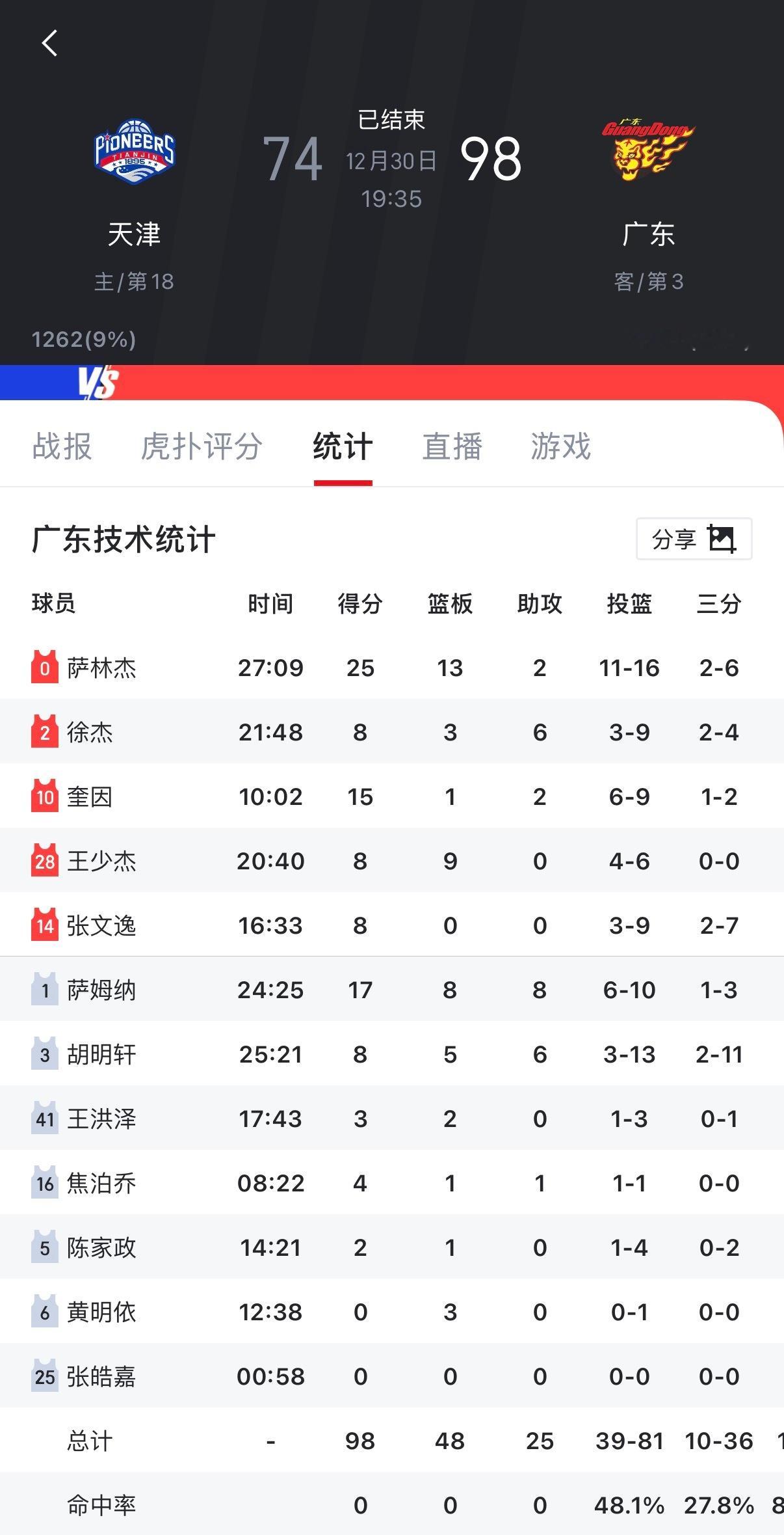 胡明轩天津男篮vs广东男篮 🏀CBA联赛25-26赛季常规赛第8轮⛹️ 全场比赛结束 广东东阳光 98 🆚 74 天津先行者数据方面:🐯胡明轩8分5篮板6助攻1抢断1盖帽 相信状态会越来越好的!奎因15分2助攻 萨林杰25分13篮板10助攻 萨姆纳17分8篮板8助攻 徐杰8分6助攻 王少杰8分9篮板 焦泊乔4分1篮板 王洪泽3分2篮板 陈家政2分1篮板 张文逸8分下一场:2026年1月1日 广东vs北京(客场)记得收看哟~ 📺