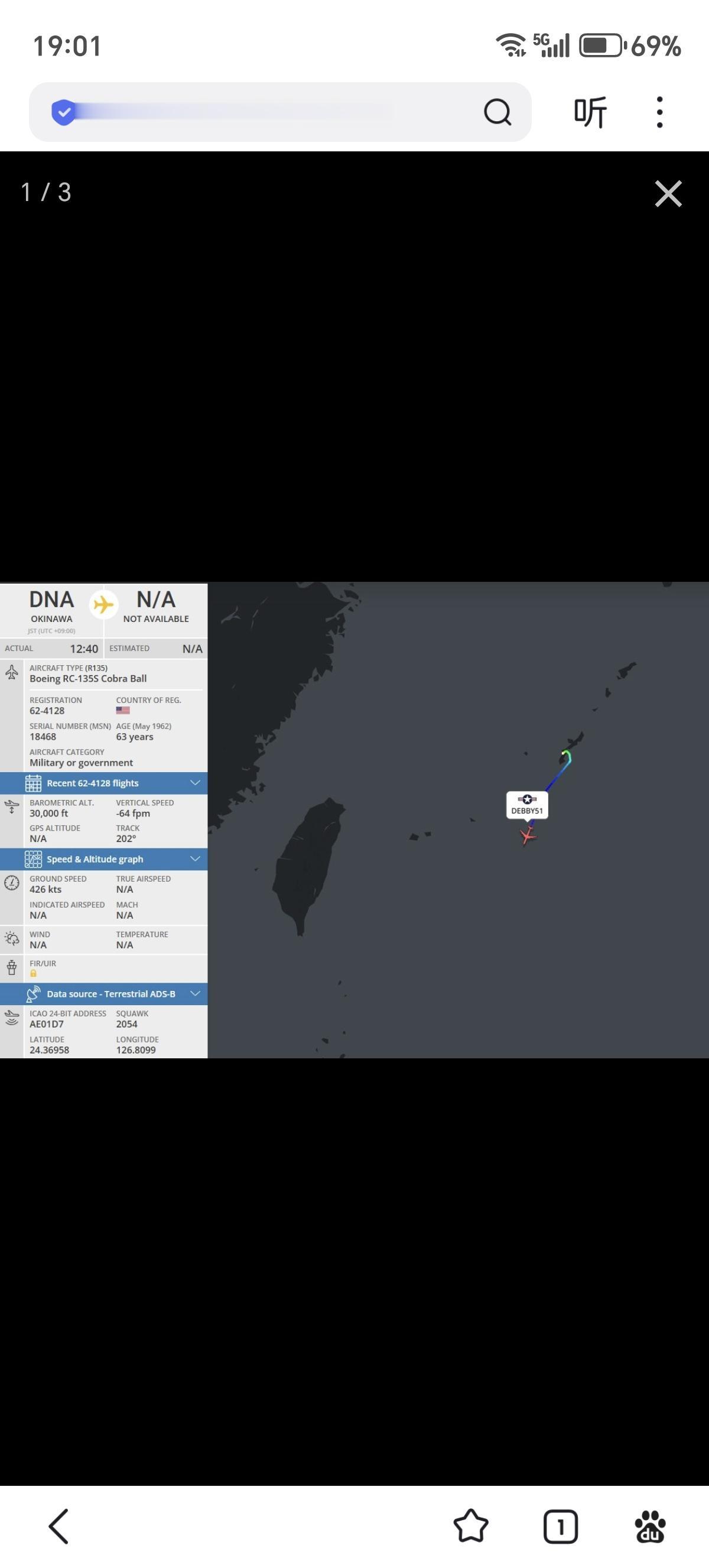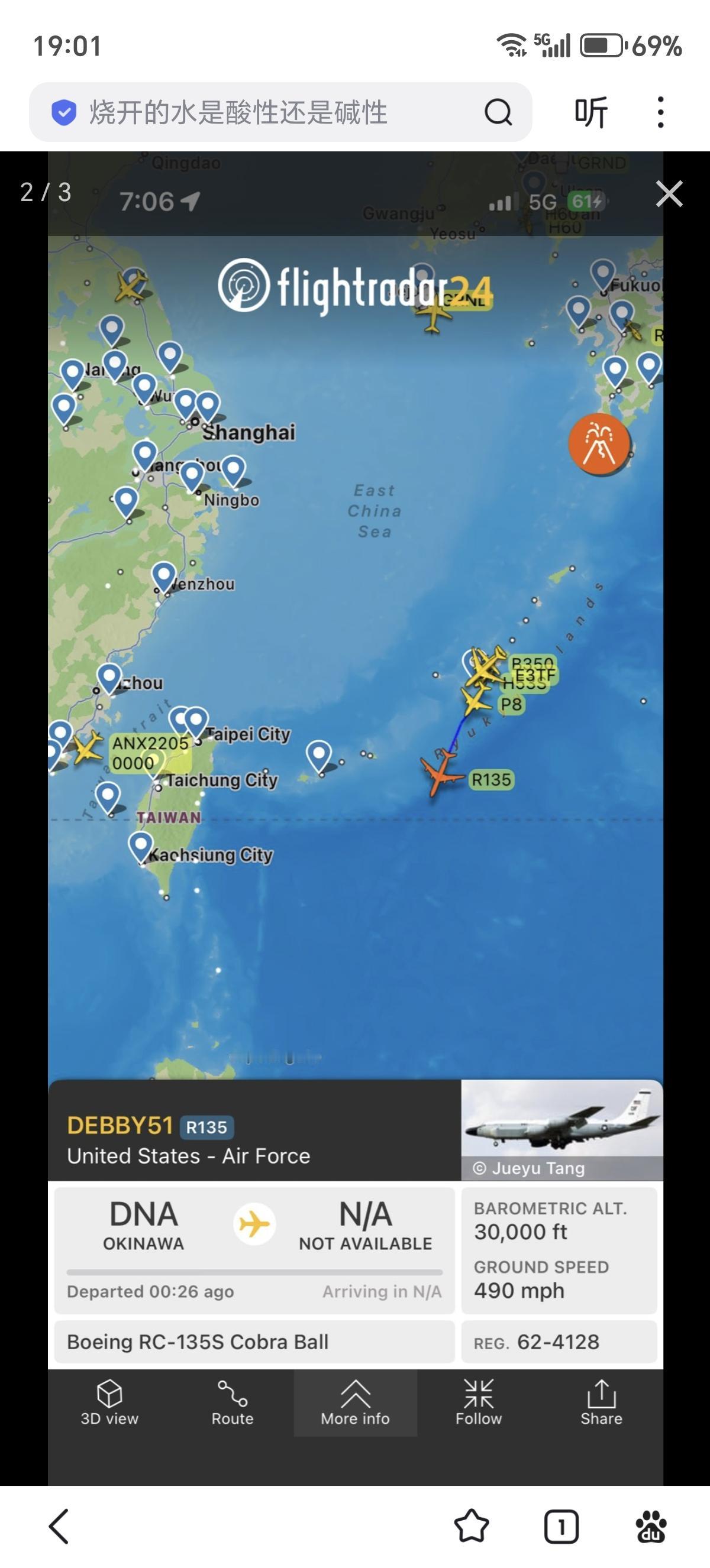 从琉球嘉手纳空军基地起飞的一架MD二等人RC-135S“眼镜蛇球”侦察机、E-3C”望楼“预警机和一架一等人P-8“海神”反潜巡逻机向南飞行,RC - 135S是二等人使用的一种弹道导弹监视和侦察机。它是一种特种飞机,其任务是利用光学和电子传感器跟踪和分析导弹从发射到弹道轨迹和落点的整个过程,以监测弹道导弹的发展。目前只装备三架,保持两架执勤,一架维修的状态。