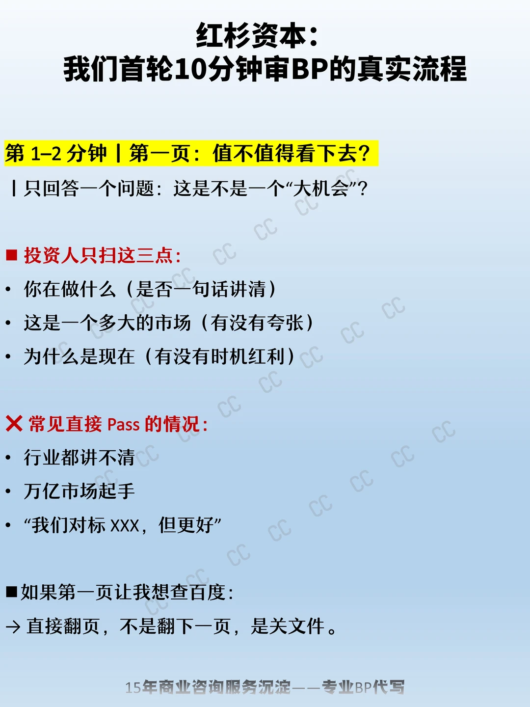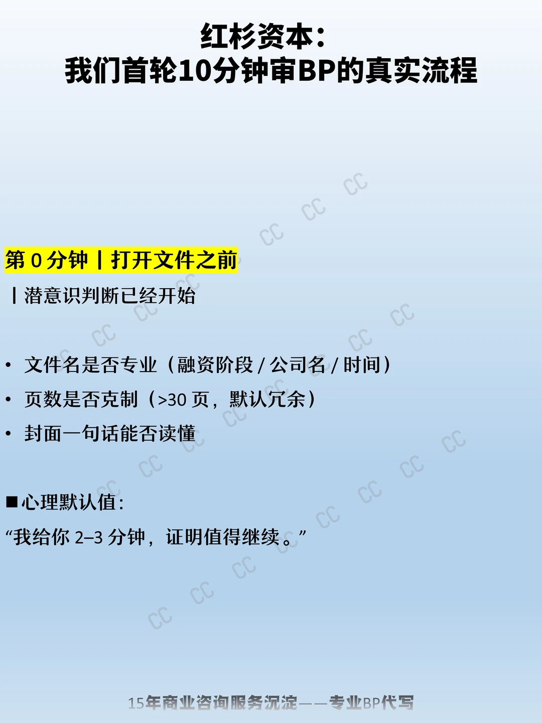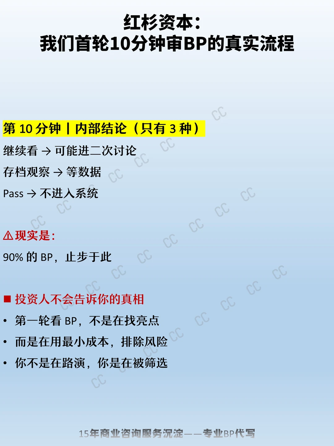 绝大多数项目,连“被认真看完”的资格都没有。第一轮,不是找理由投你,而是在极快速度里,找足够的理由不投你 如果你的 BP 扛不住这 10 分钟,那它也扛不住任何一次真正的投决
