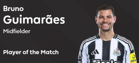 打入一球,吉马良斯当选纽卡3-1伯恩利球迷票选全场最佳