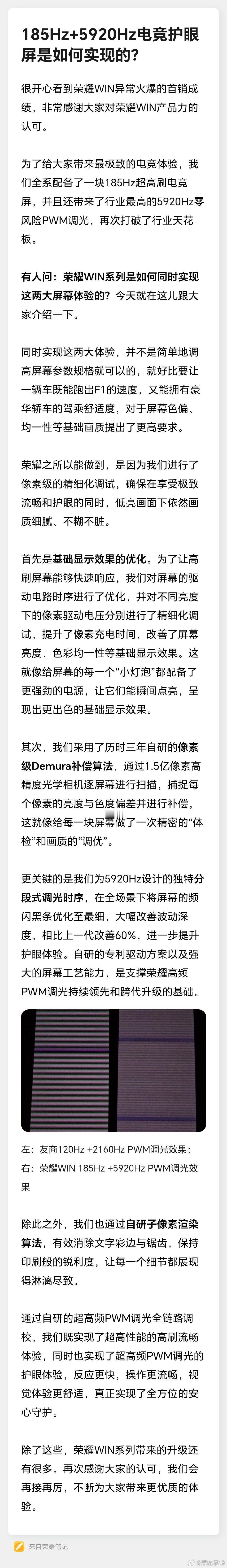 实话实说,荣耀在护眼这块一直走在前头,在很多细节上做的相当不错,可以说一直在引领。看看荣耀高管李坤、鹏哥的科普,象这次的185Hz+5920Hz电竞护眼屏更是刷新了屏幕护眼。
