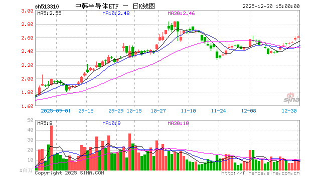 12月30日,中韩半导体ETF(513310)涨0.85%,成交额24.70亿元。当日份额增加500.00万份,最新份额为14.46亿份,近20个交易日份额增加8100.00万份。最新资产净值计算值为37.10亿元。
