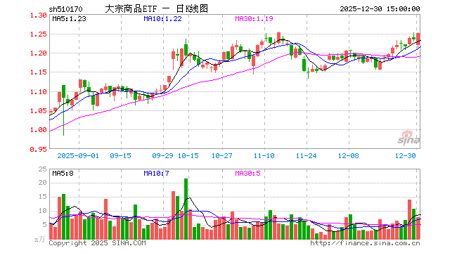 12月30日,大宗商品ETF(510170)涨1.30%,成交额949.50万元。当日份额增加200.00万份,最新份额为2.59亿份,近20个交易日份额增加1000.00万份。最新资产净值计算值为3.22亿元。