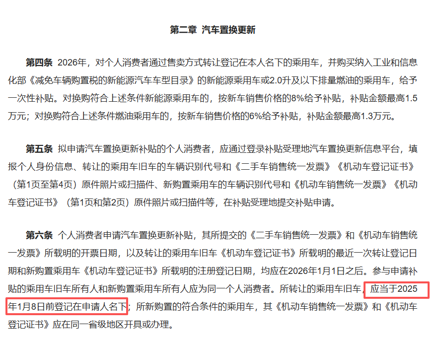 不管是汽车报废,还是置换补贴,都需要在2025年1月8日前登记在申请人名下的车才