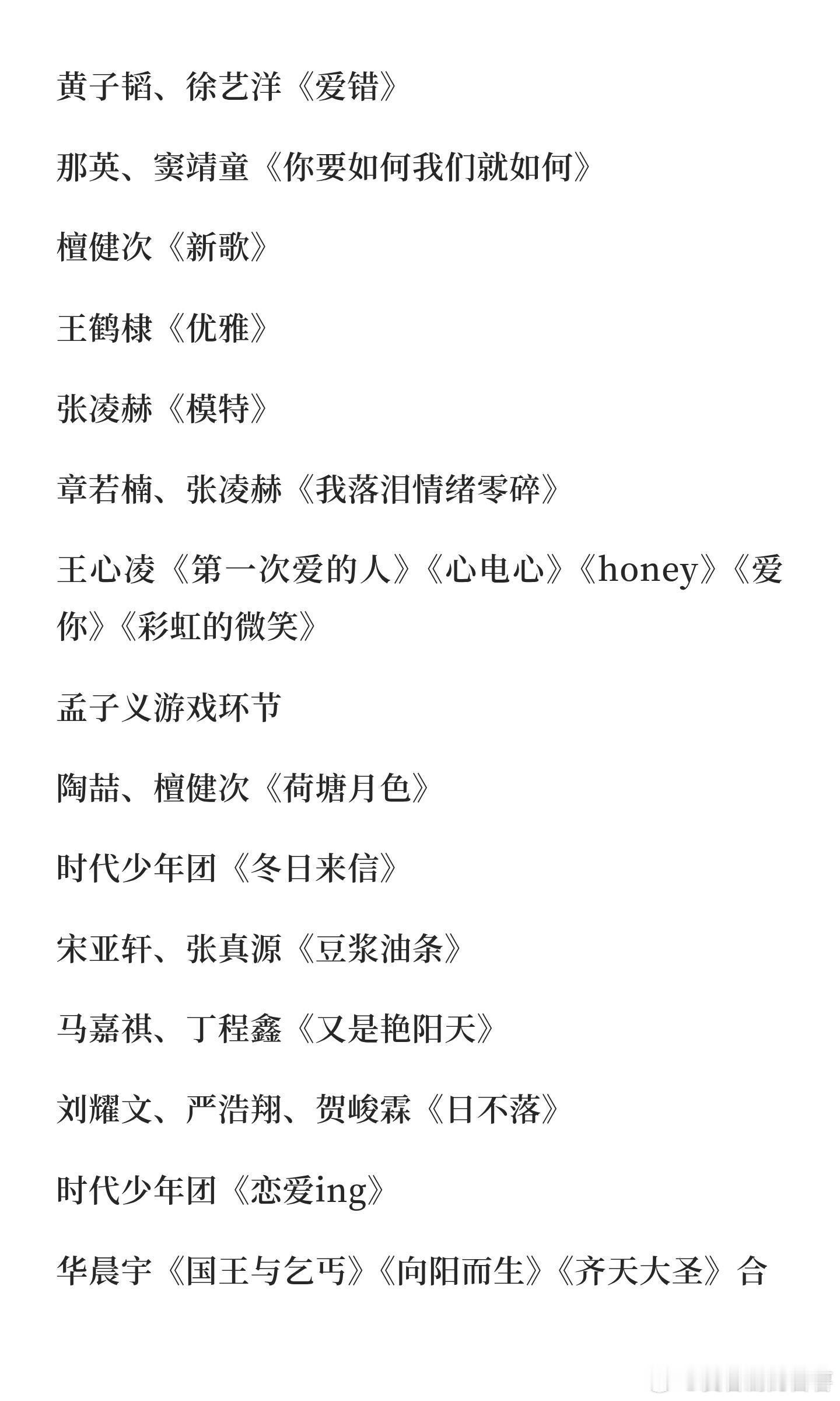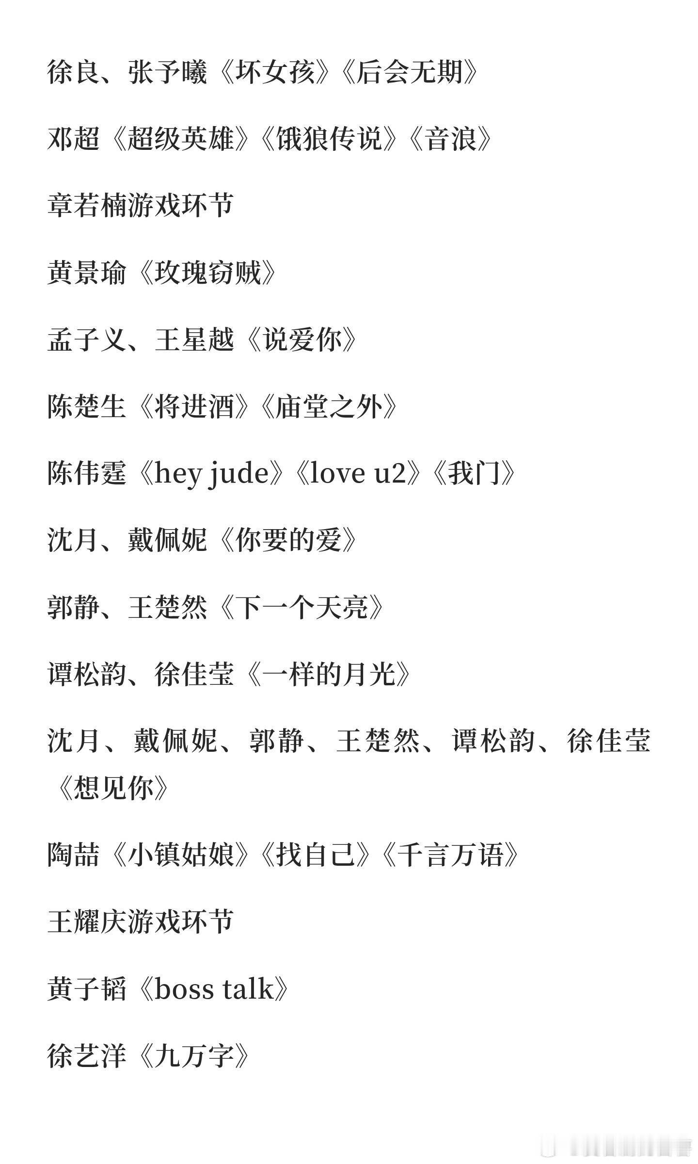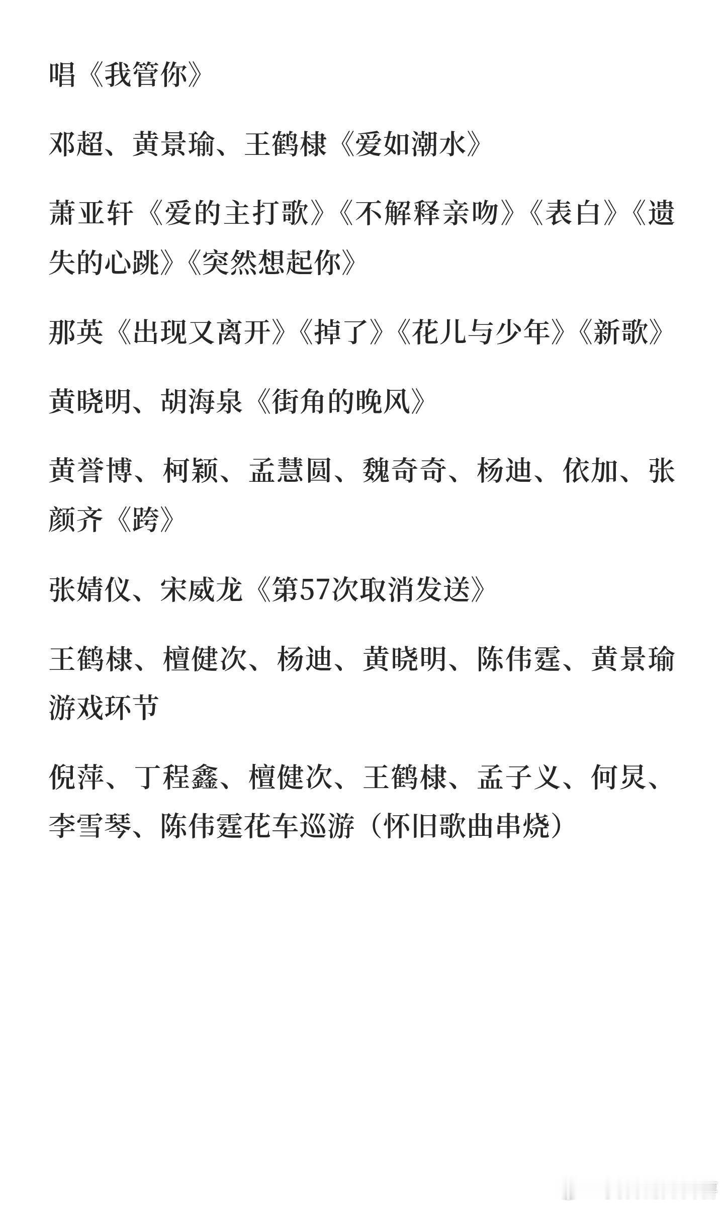 湖南卫视跨年演唱会节目单(以实际播出为准)开场秀:主持人、檀健次、王鹤棣、孟子义、李雪琴等《离开地球表面》《管他什么音乐》时代少年团、王嘉尔《对你爱不完》大张伟《我伟大的人生》戚薇、大张伟《看我七十二变》李晟、李斯丹妮、沈梦辰、吴宣仪、张予曦《我想要占据你》徐良、张予曦《坏女孩》《后会无期》邓超《超级英雄》《饿狼传说》《音浪》章若楠游戏环节黄景瑜《玫瑰窃贼》孟子义、王星越《说爱你》陈楚生《将进酒》《庙堂之外》陈伟霆《hey jude》《love u2》《我门》沈月、戴佩妮《你要的爱》郭静、王楚然《下一个天亮》谭松韵、徐佳莹《一样的月光》沈月、戴佩妮、郭静、王楚然、谭松韵、徐佳莹《想见你》陶喆《小镇姑娘》《找自己》《千言万语》王耀庆游戏环节黄子韬《boss talk》徐艺洋《九万字》黄子韬、徐艺洋《爱错》那英、窦靖童《你要如何我们就如何》檀健次《新歌》王鹤棣《优雅》张凌赫《模特》章若楠、张凌赫《我落泪情绪零碎》王心凌《第一次爱的人》《心电心》《honey》《爱你》《彩虹的微笑》孟子义游戏环节陶喆、檀健次《荷塘月色》时代少年团《冬日来信》宋亚轩、张真源《豆浆油条》马嘉祺、丁程鑫《又是艳阳天》刘耀文、严浩翔、贺峻霖《日不落》时代少年团《恋爱ing》华晨宇《国王与乞丐》《向阳而生》《齐天大圣》合唱《我管你》邓超、黄景瑜、王鹤棣《爱如潮水》萧亚轩《爱的主打歌》《不解释亲吻》《表白》《遗失的心跳》《突然想起你》那英《出现又离开》《掉了》《花儿与少年》《新歌》黄晓明、胡海泉《街角的晚风》黄誉博、柯颖、孟慧圆、魏奇奇、杨迪、依加、张颜齐《跨》张婧仪、宋威龙《第57次取消发送》 王鹤棣、檀健次、杨迪、黄晓明、陈伟霆、黄景瑜游戏环节倪萍、丁程鑫、檀健次、王鹤棣、孟子义、何炅、李雪琴、陈伟霆花车巡游(怀旧歌曲串烧)湖南卫视跨年演唱会|