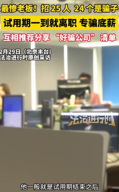 “大冤种!”北京丰台,一女子开公司,招聘25个员工,其中有24个人都是骗子,不需要公司给交社保,试用期一到就离职,拿着底薪脚底抹油,24个人还互相推荐“好骗公司”清单。女子彻底傻眼了。网友:这种公司不冤,懂得都懂! 女子之前在互联网公司做了8年行政管理。今年下半年,她咬牙辞职,和朋友合伙在丰台注册了一家咨询服务类公司。 公司不大,但前期资金投入不小,租了写字楼、买了设备,最重要的,是急需人手。 “我当时的想法很简单,先把团队搭起来,业务慢慢跑。”女子回忆。 招聘信息一发布,简历像雪片一样飞来。短短一周,她就面试了三十多人,最终录用了25人。 让她觉得“运气好到离谱”的是—— 面试几乎都很顺利 大部分人表达能力强、履历看起来“刚刚好” 还有不少人明确表示:不要求公司缴纳社保 “当时我还觉得,创业真是赶上好时候了,员工体谅老板不容易。”她苦笑着说。 员工陆续入职后,女子渐渐察觉到不对劲。 这些人有几个共同特点: 准点下班,从不加班 工作只做“表面文章”,文件漂亮、内容空洞 遇到核心任务就推诿,“等领导确认”“再优化一下” 从不主动学习业务,只完成最低限度要求 但最奇怪的是,他们纪律意识异常一致。 不迟到,但永远踩点 不请假,但经常“临时有事提前走” 不违反明文规定,却总在规则边缘游走 “就像一群人商量好了一样,谁都不出头,谁也不犯大错。”女子说。 真正让女子警觉的,是试用期满前后的异常。 第一个员工在试用期刚满30天那天,提交了辞职申请,理由是“个人发展规划不符”。 第二天,又有两个人提出离职。 一周内,离职人数飙到十几人。 而且,他们离开的节奏几乎一致: 试用期一到,立刻走人 工资到手,当天消失 微信不拉黑,但再也不回 女子越想越不对,开始复盘员工资料,才发现一个惊人的事实: 这些人之间,彼此认识。 有人简历上的前公司,正是另一名员工“上上家公司”; 有人入职当天,就和“同事”在楼下热聊; 甚至还有人,推荐“熟人”来面试,而这些“熟人”,同样在试用期满后消失。 直到最后清点人员,她才彻底崩溃——25个员工里,只有1个人是真正来干活的。 更让人震惊的是,警方介入后发现,这并不是零散个案。 这24个人,实际上属于一个松散却成熟的圈子。他们私下有微信群、论坛账号,专门交流一件事: 哪家公司“好骗”。 群里会共享一份隐秘的“清单”,内容包括: 哪些公司面试流程简单,“十拿九稳能过” 哪些老板是第一次创业,“心软、好说话” 哪些公司不严格打卡,管理松散 哪些公司发工资痛快,从不拖欠 甚至还会互相提醒: “这家公司试用期30天,记住别干太多活。” “老板不懂业务,做PPT就行。” “快到期了,准备撤。” 他们把这种行为,称为一种“职业”—— 挂职。 所谓“挂职”,就是名义上在公司任职,实际上不投入真实劳动,只混底薪。 调查发现: 每个人同时挂职两到三家公司是常态 有人最多同时“就职”五家公司 每月靠底薪就能拿到一万多元 几乎没有法律风险 “反正是试用期,走人很正常。”这是他们的统一心理。 更讽刺的是,他们彼此之间形成了默契: 不抢同一家公司 轮流推荐“资源” 谁踩雷了,就立刻在群里提醒 对女子来说,真正的损失并不只是钱。 账算下来,这24个人,每人底薪五六千,加起来不过十几万元。 但她付出的,是: 三个月的时间 公司业务全面停滞 合伙人信心崩塌 对“招聘”和“信任”的彻底怀疑 “我不是心疼钱,我是觉得自己被当傻子一样围猎。”她红着眼眶说。 事件曝光后,网络迅速炸锅。 有人冷嘲: “这种公司不冤,懂的都懂。” 也有人愤怒: “这是赤裸裸的诈骗,别美化成挂职。” 还有创业者感同身受: “第一次创业,谁没被社会上过课?”