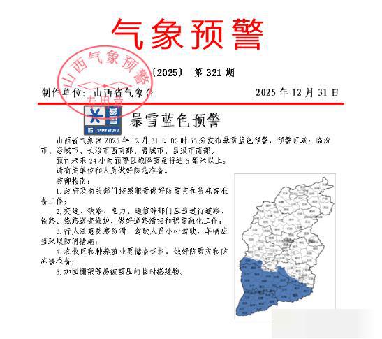 山西省气象台2025年12月31日06时55分发布暴雪蓝色预警,预警区域:临汾市、运城市、长治市西南部、晋城市、吕梁市南部。预计未来24小时预警区域降雪量将达5毫米以上。请有关单位和人员做好防范准备。