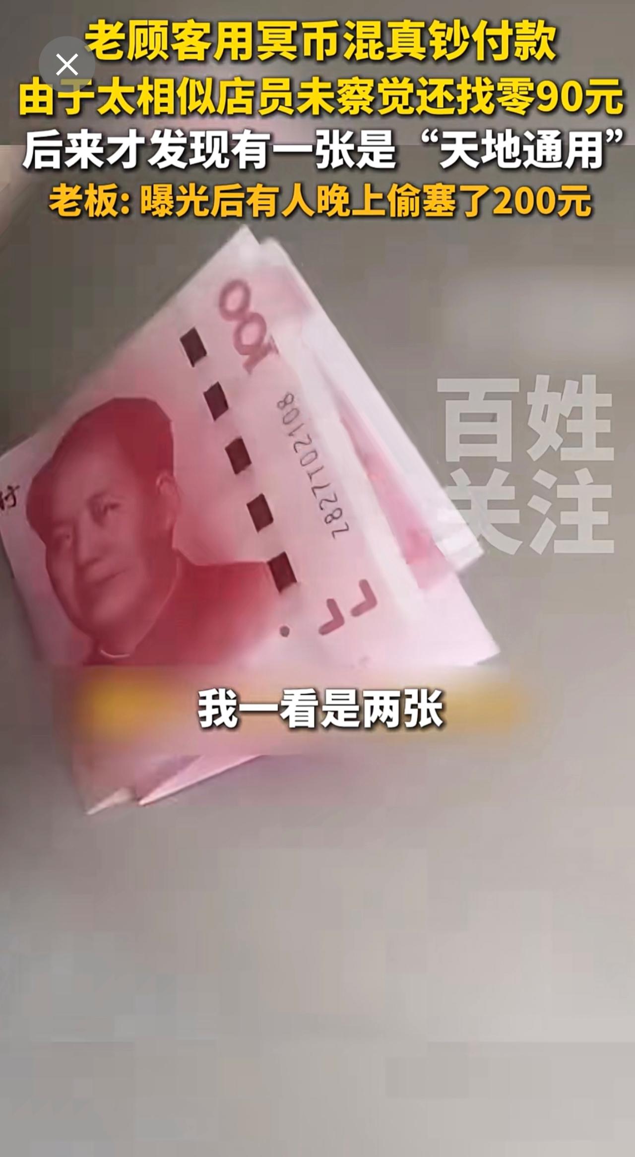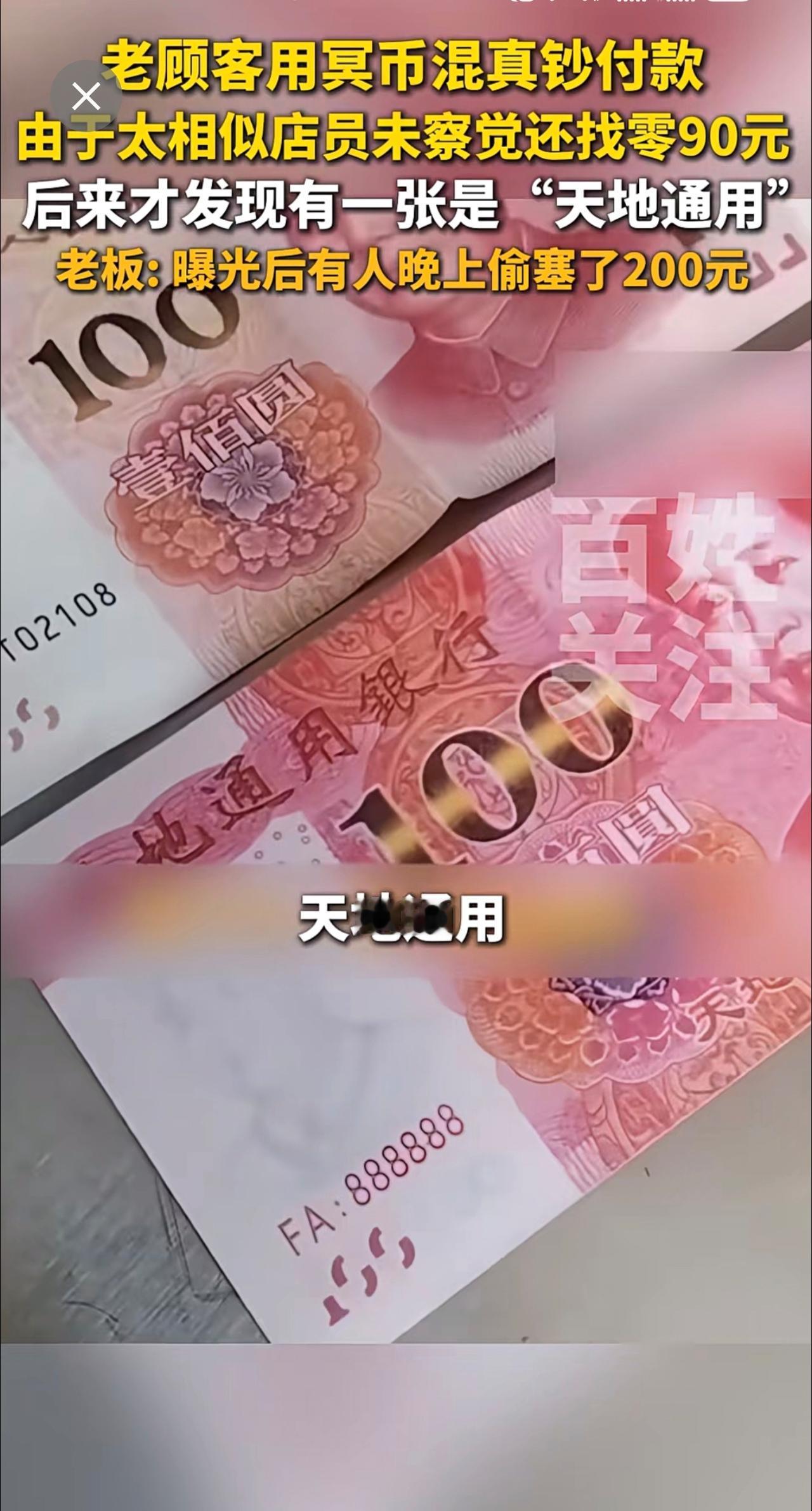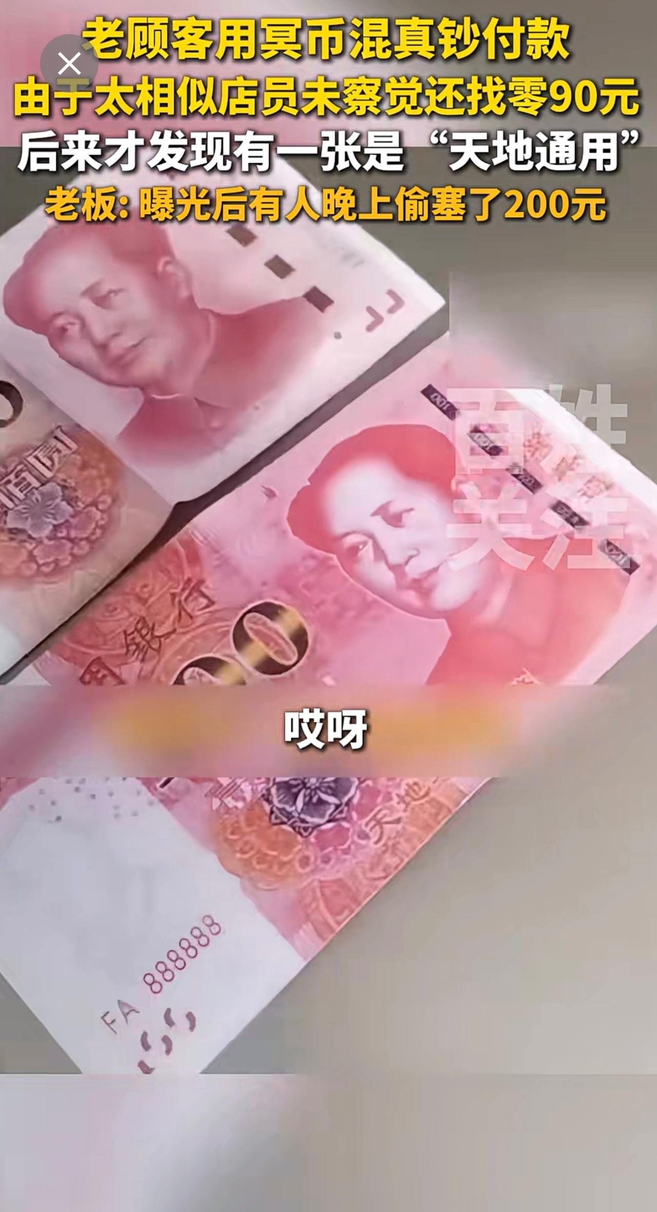 老顾客用冥币混真钞付款,由于太相似店员未察觉还找零90元!