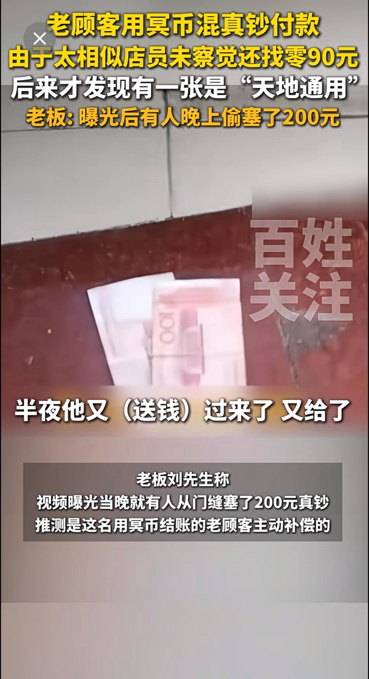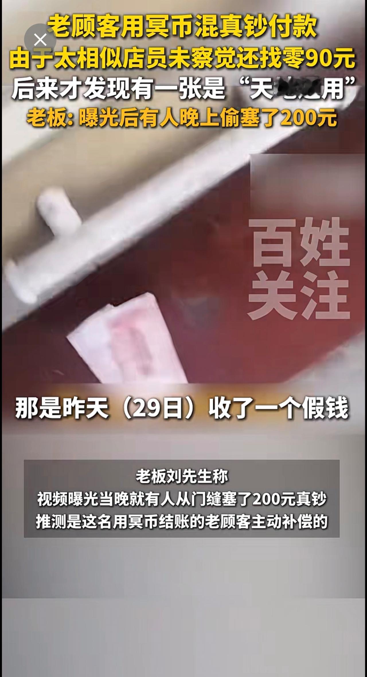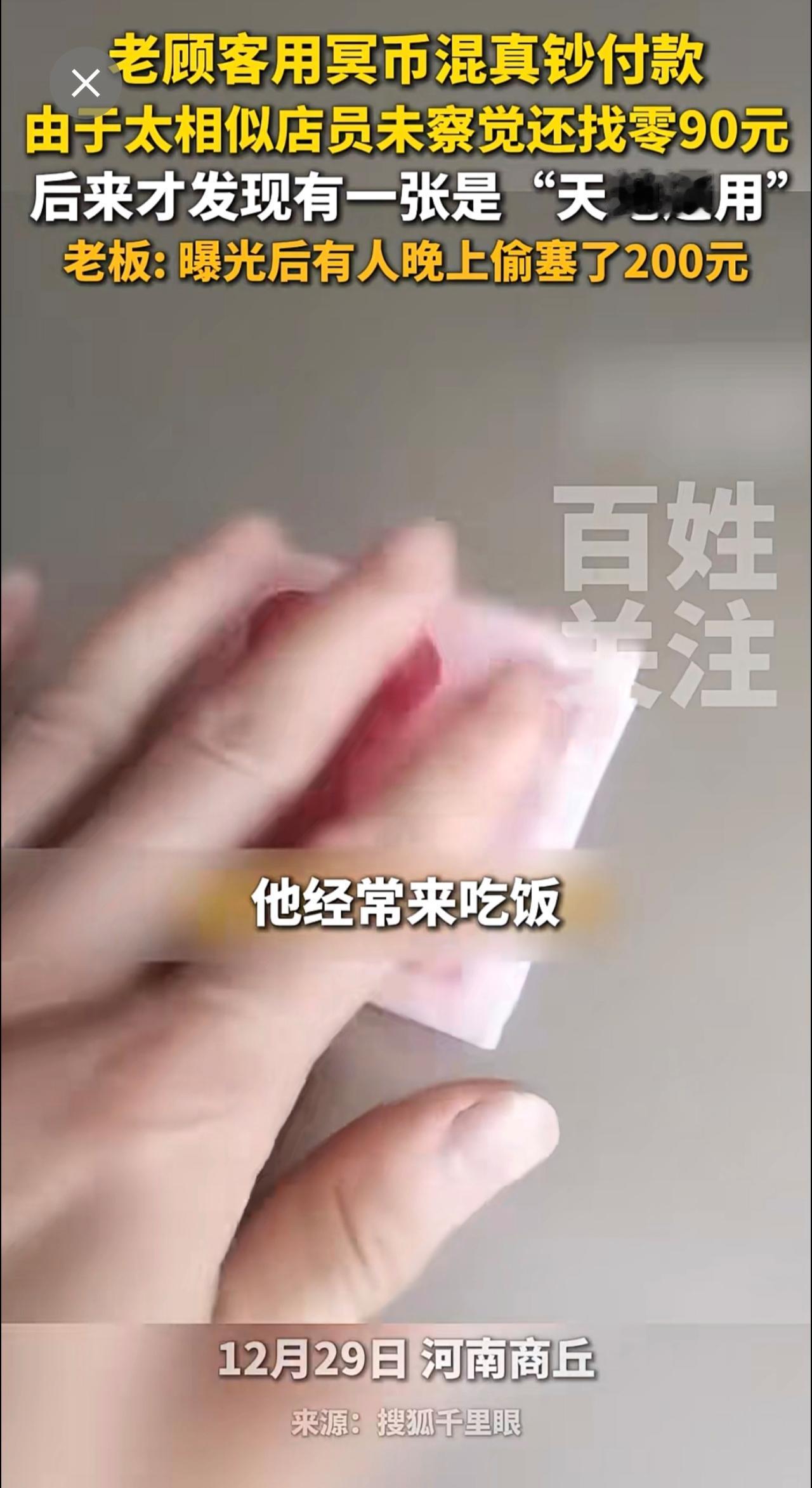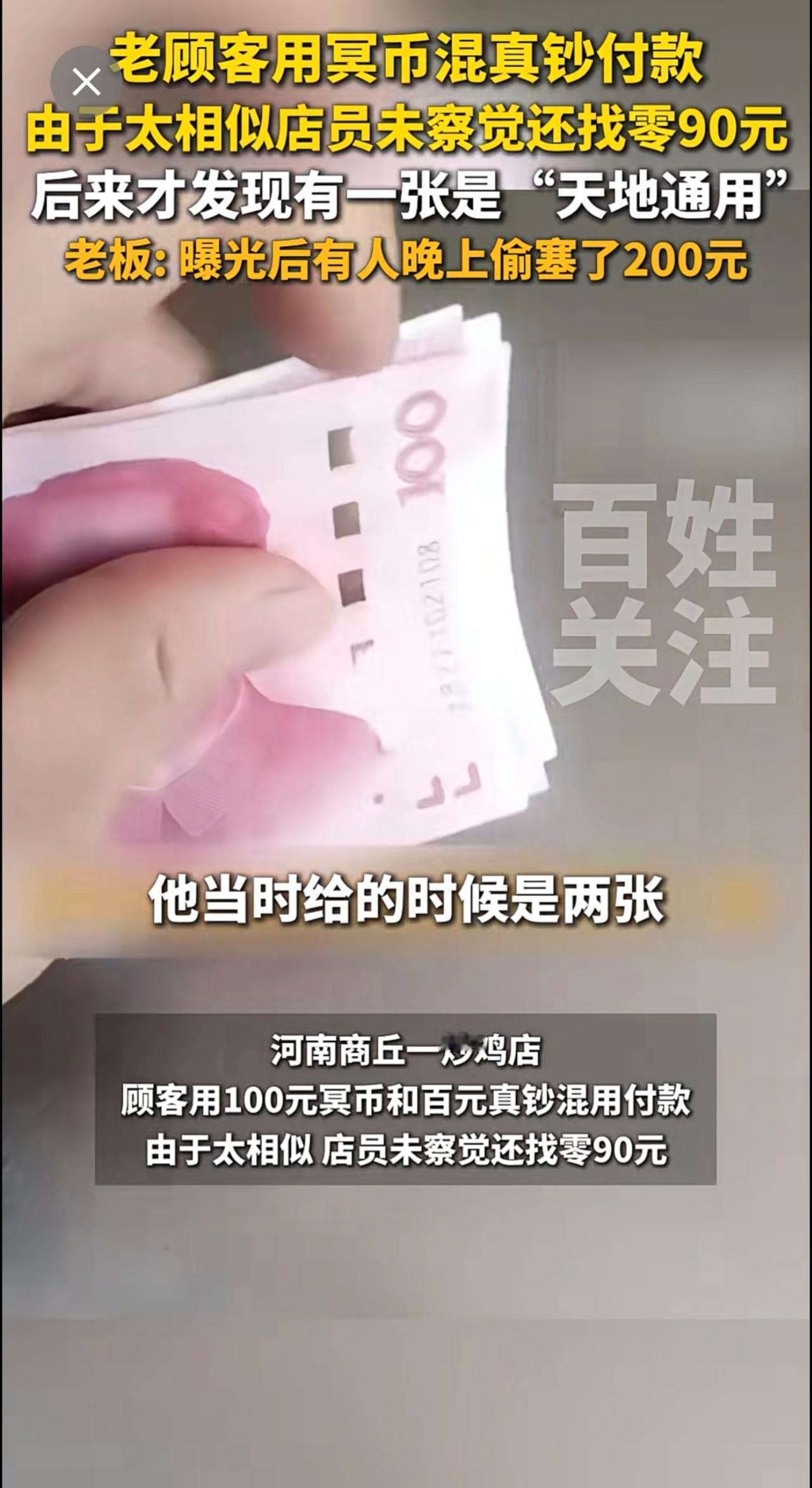 老顾客用冥币混真钞付款,由于太相似店员未察觉还找零90元!