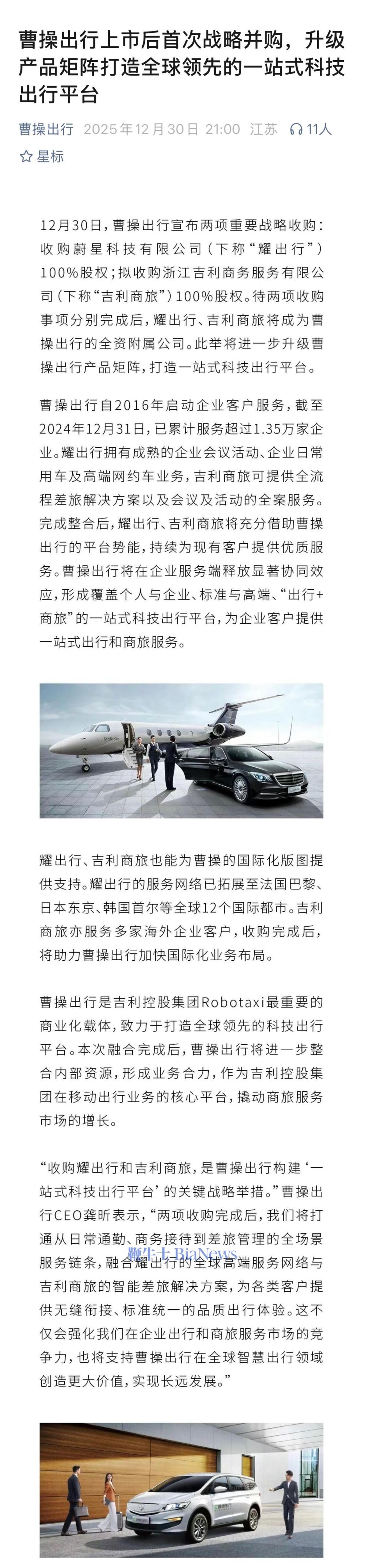 12月30日,曹操出行宣布两项战略收购:收购蔚星科技有限公司100%股权;拟收购浙江吉利商务服务有限公司100%股权。待两项收购事项分别完成后,耀出行、吉利商旅将成为曹操出行的全资附属公司。
