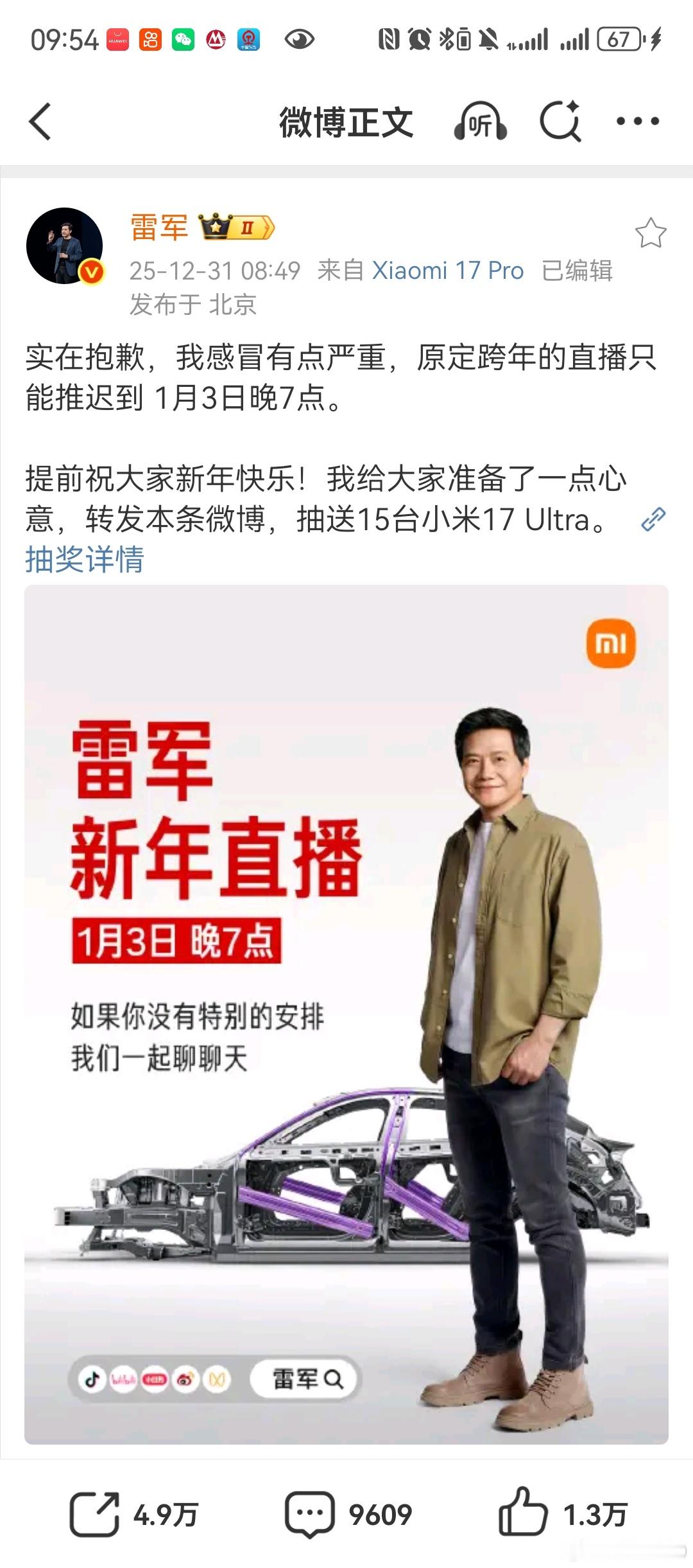 跨年直播推迟到1月3号了马上就2026年了,今晚也给大家发红包,感谢大家的支持 雷军跨年直播推迟