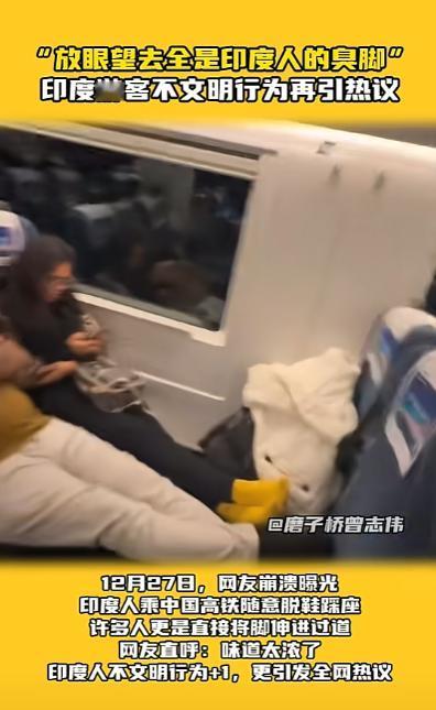 “滚回自己的国家!”12月27日,四川,一男子刚上高铁,就看见一群印度人在车上脱下了鞋,光脚踩在座椅上,甚至有不少人直接躺下将脚伸到过道,不仅影响乘客通行,脚臭味更是弥漫整个车厢,熏得周围乘客纷纷捂鼻。网友:隔着屏幕都有味! 四川一趟发往省外的高铁刚启动十分钟,车厢中部就泛起了一阵奇怪的味道。 最初只是淡淡的异味,没几分钟就变得浓烈起来 —— 几排相连的座位区里,十多个印度乘客正陆续解开鞋带,把鞋子随手踢到座椅下方的空隙里,光脚直接踩在了座椅的靠背上。 有人嫌座位挤,干脆侧过身横躺在相邻的两个空位上,双腿伸直往过道中间一搭,脚尖刚好抵在对面座位的扶手边缘;还有个穿条纹衬衫的乘客,直接把脚翘到了前排的小桌板上,脚趾还随着车身的晃动轻轻晃着。 异味顺着空调出风口往四周扩散,先是前排的乘客下意识地皱起眉,有人低头嗅了嗅,随即掏出包里的纸巾,叠了好几层捂在鼻子上。 没过多久,周围几排的乘客都有了反应:有个背着双肩包的年轻人,从包里翻出口罩飞快戴上,还特意把口罩的金属条按紧;坐在过道旁的一位大姐,本来正端着水杯喝水,瞥见伸到跟前的光脚,赶紧把杯子往怀里收,同时往窗边挪了挪身子,尽量离那些脚远一点。 列车员推着餐车经过这里时,餐车上的香味都盖不住车厢里的异味。他停下餐车,先把餐车往旁边挪了挪,才上前用英语提醒:“各位先生,请把鞋子穿上,脚不要放在座椅和过道里,这是公共区域,请配合一下。” 说着还指了指头顶 “禁止赤脚踩踏座椅” 的标识牌。 但这些印度乘客只是抬头笑了笑,有的稍微把脚往座椅内侧收了收,有的甚至把脚抬得更高了些;其中一个穿白色 T 恤的乘客,还对着列车员摆了摆手,嘴里念叨着听不懂的语言。 列车员没办法,只能挨着个重复提醒,折腾了快十分钟,才勉强让几个人把踩在桌板上的脚放下来,可脱鞋、躺卧的情况始终没彻底改变。餐车推走的时候,列车员还特意多往这个区域看了两眼,脸上带着无奈。 这一幕被后座的乘客用手机拍了下来,配上 “四川高铁上的窒息时刻” 的文字发到社交平台,不到两小时就成了热点。网友的评论飞快涌了进来: “公共场合这么做也太没素质了,脚伸到别人跟前算怎么回事” “不管哪国人,出门在外都得守公共规矩吧?这味儿谁顶得住” “上次在地铁遇到脱鞋的,我直接换了节车厢,这种真的太影响人了”, 还有人吐槽 “高铁是大家一起坐的,只顾自己舒服也太自私了”。 车厢里的异味一直没散,有乘客实在受不了,找列车员申请换座位,但这节车厢已经满员,只能无奈地继续捂着鼻子。有个带孩子的乘客,怕异味影响孩子,特意把孩子抱在怀里,用外套罩住了孩子的鼻子和嘴巴,自己则皱着眉硬扛着。 直到列车抵达中途的一个大站,这些印度乘客才开始收拾行李 —— 有人把毯子往座椅上一扔,有人直接踩着座椅站起来拿行李,光脚在座椅和地板上踩出淡淡的印子。 等他们全部下车后,列车员立刻通知了清洁人员,清洁人员拿着消毒喷雾,对着这些座位和周围的地板反复喷洒,还特意多开了这节车厢两端的通风口,折腾了快二十分钟,才把异味冲淡了些。 这件事其实是在告诉所有人:公共空间是集体共享的,不管来自哪个国家、什么背景,遵守秩序、顾及他人感受都是最基本的礼貌。脱鞋、躺卧、占用过道,不仅破坏了其他乘客的出行体验,也是对公共规则的忽视。出门在外,多一分自觉,就能让彼此的旅途都少一分糟心。 你在公共场合遇到过类似的不文明行为吗?来评论区说说你当时是怎么应对的吧。 信息来源:《“放眼望去全是印度人的臭脚”,印度游客不文明行为再引热议。你遇到会怎么办?》搜狐新闻客户端