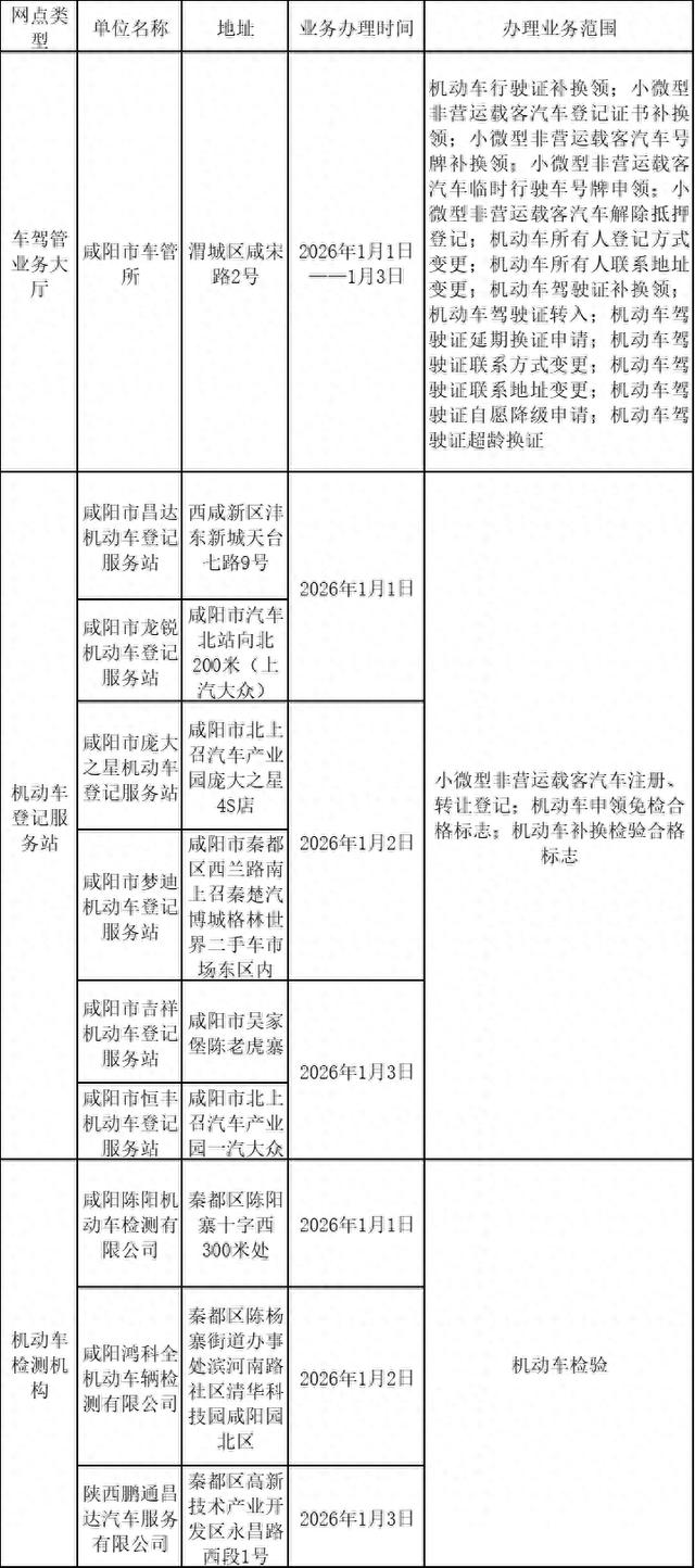 为满足群众节假日期间办理车驾管业务需求,咸阳市公安局交通警察支队车管所元旦期间正常办理机动车补换牌证、驾驶证补换证及小微型非营运载客汽车登记、机动车检验等业务。现将有关情况通告如下: