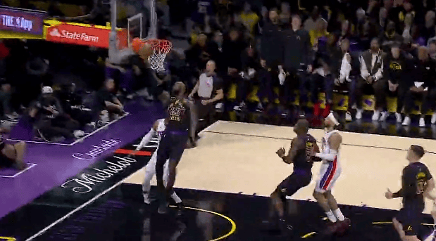 詹姆斯快攻反击上反篮打进,生日夜开局拿到2分2助攻