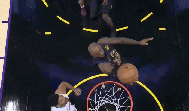 第一节比赛中,詹姆斯快攻反击上反篮打进,生日夜开局拿到2分2助攻。