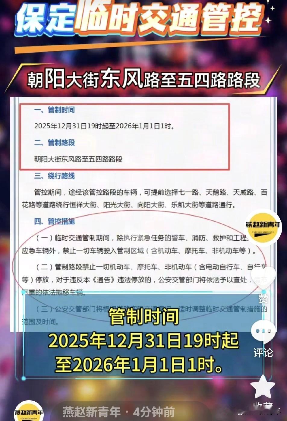 注意了!保定今晚万博广场的朝阳大街(东风路至五四路路段)将实施临时交通管制,禁止车辆驶入和停放,大家提前做跨年安排行程!