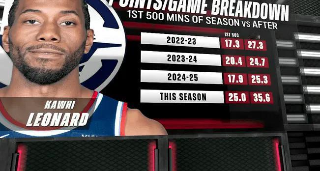 别千万不要碰瓷杜兰特,伦纳德固然牛逼,但是,他和杜兰特差别,是车尾灯都看不到的。 不可否认,随着,这个赛季,快船赛季初,比尔就赛季报销。 球队一团乱麻,急需要伦纳德。 伦纳德也逐渐地打出好数据,伦纳德本赛季,前500分钟,场均得到25分,之后,把比赛场均提高到35.6分。 毫无疑问,这数据炸裂。 但是,这对伦纳德来说,是炸裂,但是,对杜兰特来说,那仅仅只是日常而已。 如今,杜兰特不在那个维度了,毫不夸张地说,如今,杜兰特想要得分,每个夜晚,40+,那吃饭喝水一样简单的。