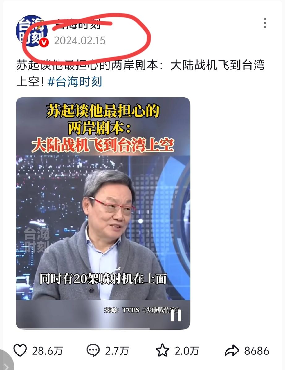 这不是神预言! 这是愿望照进现实。 苏起一年前“神预言”,他“最担心的剧本”成真了。 他说:人们谈将来两岸最担心的一个剧本是什么?我最担心的那个剧本就是大陆的战机飞到我们的上空,他夜航晚上来,我们飞机根本上不去,它照一张101的这个空照,那我们面子很难看。 这不,“预言”已经在2025.12.29这一天实现了,战机、夜航、101大楼空照都全了。正儿八经的就是按照你的想法来的,只要想要的国家都会满足你。 还有这不是上不上去的问题,而是发现都发现不了。 大家预测一下,下一个剧本是什么?