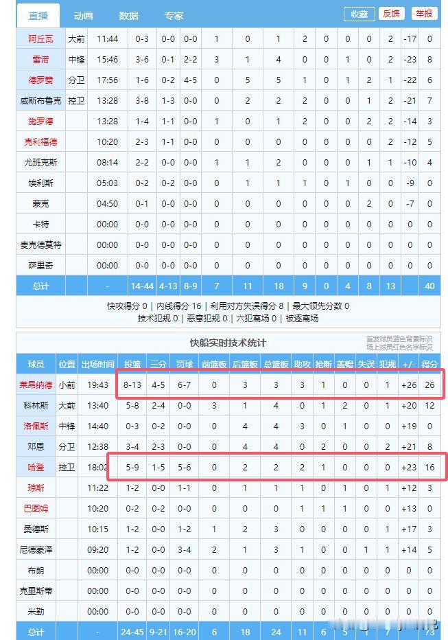 这恐怖的防守能力!快船主场半场打花了国王队!小卡状态依旧爆表,半场26分3板3助1断,投篮13中8,其中三分5中4。 直播页面数据显示,快船最近4场和之前27场数据对比, 三分命中率:46% VS 36%,差距不是一般大, 进攻效率(百回合得分):126.2 VS 112.8,完全释放了进攻潜力, 防守效率(百回合失分):108.7 VS 118.9,防守致胜,最近几场对手都没得高分。 国王队两节各得20分,快船则是34分和39分,这球怎么打?