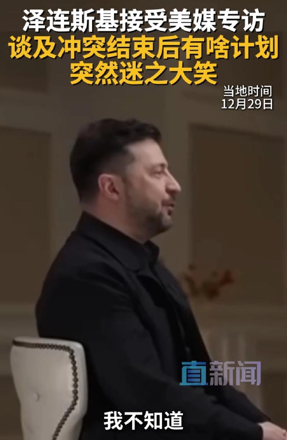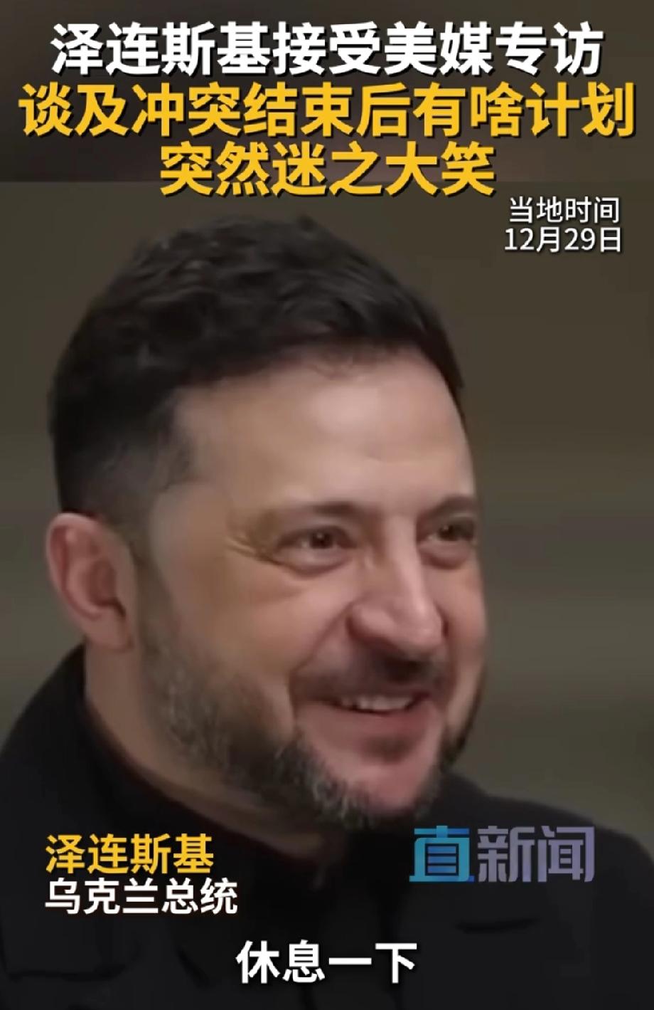 泽连斯基大笑回应卸任后安排 2025年12月29日,在和特朗普会晤后,泽连斯基面对美国主持人关于卸任后安排的提问,放声大笑称“太想好好休息了”。这笑声乍一听轻松,可他那双布满血丝、难掩疲惫的眼睛,却出卖了背后的沉重。 自2022年战争全面爆发,他从喜剧演员变身战时总统,高强度运作近四年,穿梭于废墟、地堡和国际会场。他的疲惫,也是乌克兰国家精疲力竭的写照。他流露出的卸任休息渴望,或许预示着一场看不到终点的马拉松,该有新的转折点了。