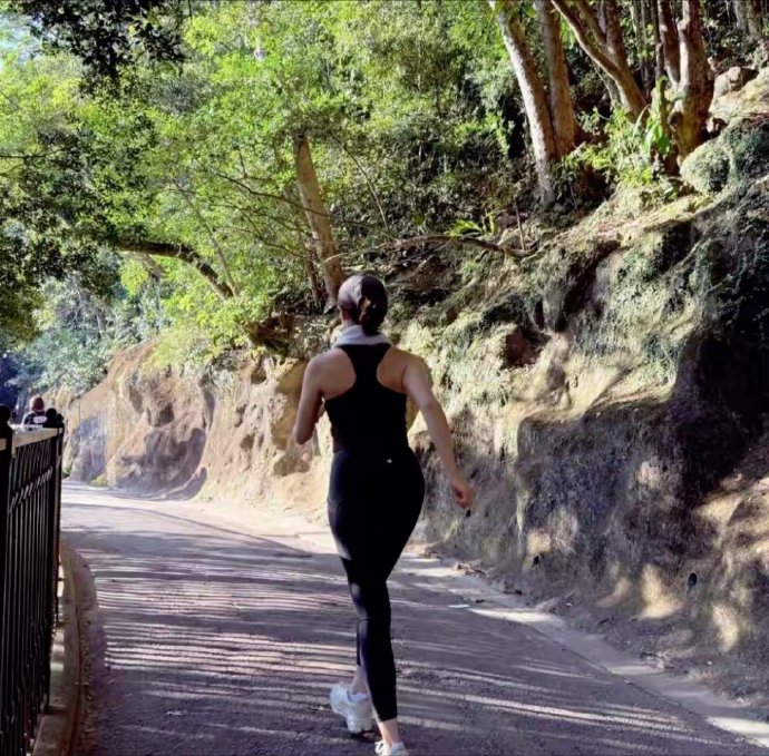 54岁黎姿在香港登山跑步,她穿着黑色背心和紧身裤,身材凹凸有致