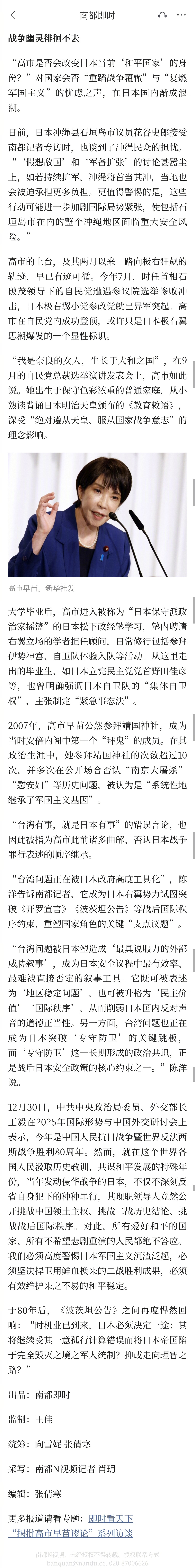 #高市谬论年末再观察#【幽灵在世界徘徊:高市早苗抛出谬论后的加速右倾与各界隐忧】#2026日本会继续加速右倾吗#年末已至。高市早苗上台两月余,日本在极右道路上狂飙突进,未有刹车迹象。过去一周内,高市内阁批准2026年财年预算案,或将实现防卫费“14连增”;“安保三文件”修订计划已成,将于明年夏天制定概要方案;“高市早苗将参拜靖国神社”的消息甚嚣尘上,让持续已久的日本“军国主义复燃”讨论再添烈火。在高市早苗涉台错误言论阴影笼罩下,展望2026,战争的幽灵在“日本丸”驰骋海域之上徘徊不去。连日来,南都N视频持续推出“揭批高市早苗谬论”系列访谈,多位日本国内专家、学者,台湾政界领袖及国际权威人士均表达了担忧,并痛斥日本公然挑战一个中国原则,使深陷动荡冲突的世界持续承压。中国驻日本大使馆、台湾《中国时报》等在海内外平台广泛转引。幼时埋下的右翼政治基因,成长途中多有接触的军国主义思想,从政以来数度发表扭曲、否认日本战争罪行的恶劣言论,为高市“众叛亲离”的现状埋下伏笔。有日本国际问题专家向南都N视频记者指出,高市内阁“程序不正义”的决策模式,不仅损害日本民主制度的合法性,更将日本推向军事扩张的危险道路,给亚太地区和平稳定带来严重威胁。