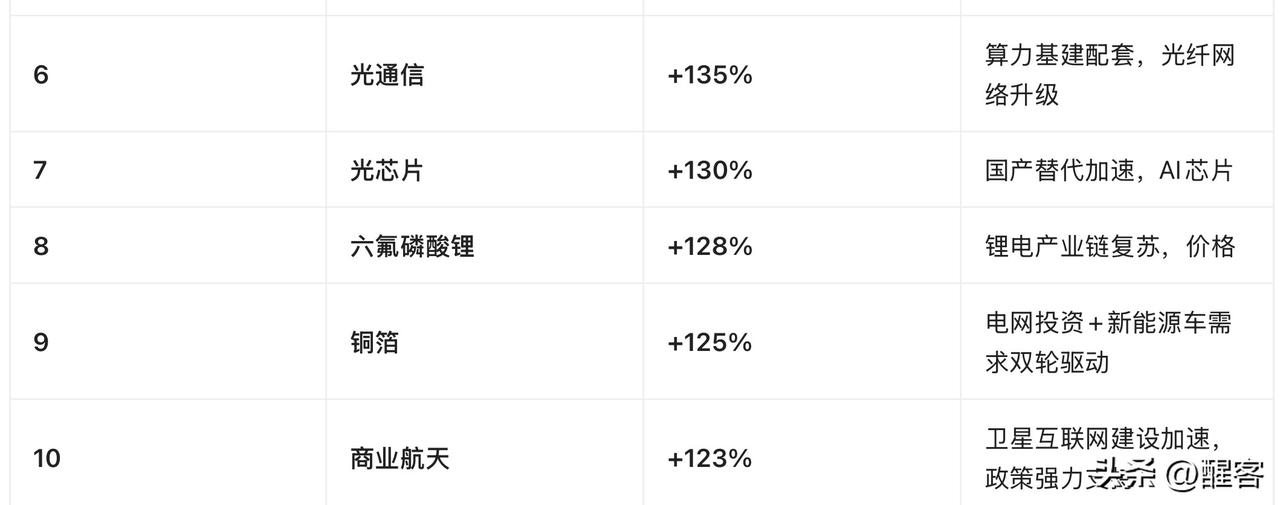 2025年A股涨幅“诸神之战”:Top 10 概念板块。今年涨幅最大的板块几乎被AI算力、新能源(储能)、有色金属三大阵营包揽。 1、光模块(CPO) +198% 2、锂电电解液。 +177% 3、玻璃纤维 +150% 4、白银 +145% 5、钨矿 +142% 6、光通信 +135% 7、光芯片 +130% 8、六氟磷酸锂 +128% 9、铜箔 +125% 10、商业航天 +123% 马上就要进入2026年了,目前的市场信号显示,科技成长的主线逻辑依然没有改变,如果你在2025年错过了这些热点,在新的一年重点关注业绩兑现能力强的科技细分领域。