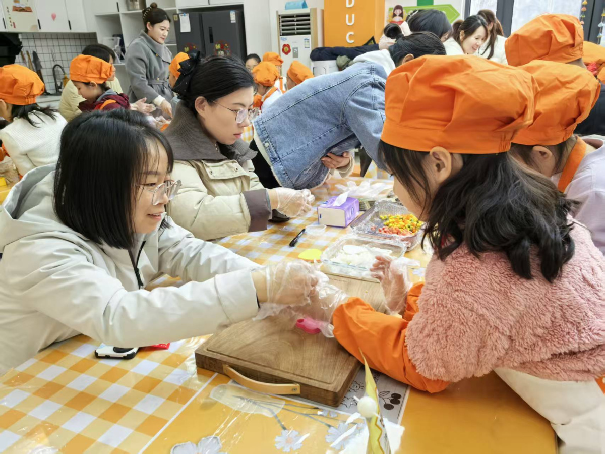 随后进入“食之共生”实践阶段,亲子协作完成健康菜品制作,孩子担任“小主厨”、家长协助执行,在实践中融入安全教育、责任分担与问题解决等家庭教育要点,厨房成为生动的家庭教育实景。