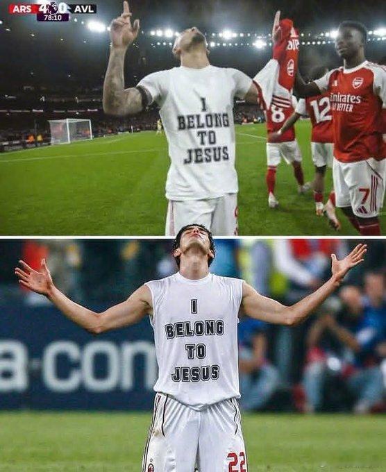 【复刻经典】阿森纳前锋热苏斯打入伤愈回归后的首球,他复刻了卡卡在2007年欧冠决赛后的“I Belong to Jesus”。英超