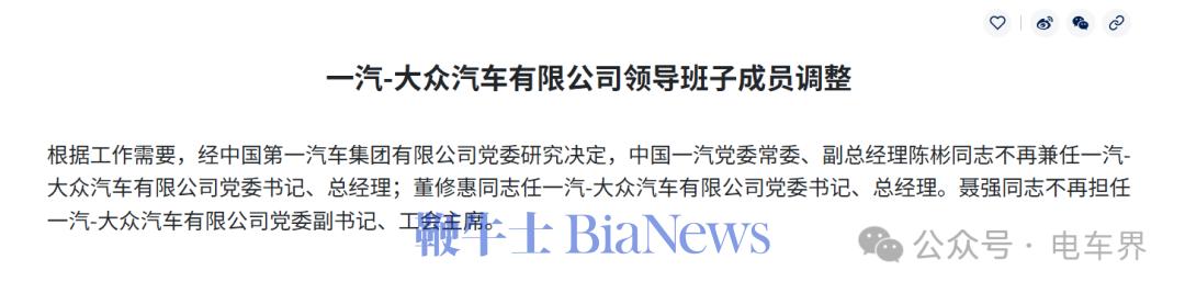 今日,一汽-大众汽车有限公司发布领导班子成员调整公告。
