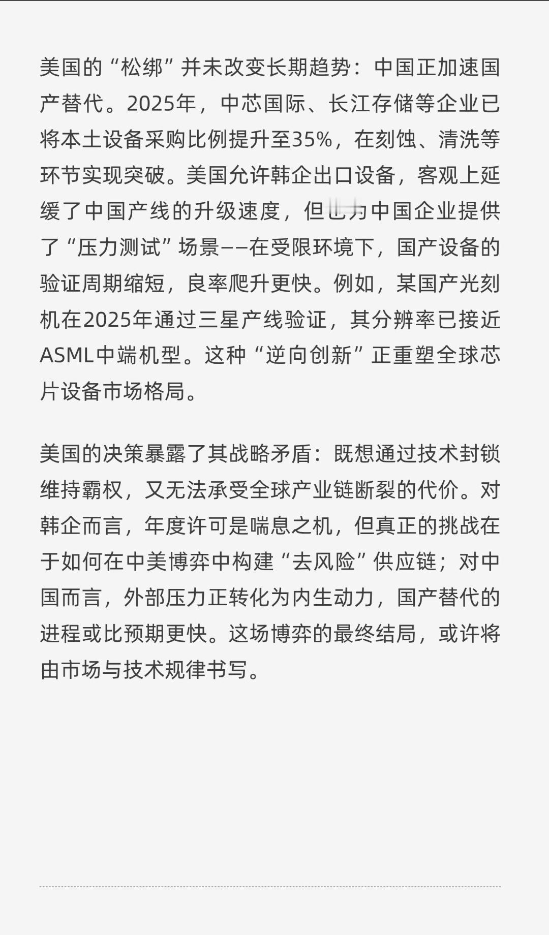 | 2025年末,美国批准三星、SK海力士在2026年向中国出口芯片制造设备的消息引发关注。这一决策并非简单的政策转向,而是美国在技术霸权、盟友关系与全球产业链稳定之间权衡后的妥协。2023年10月,三星、SK海力士曾获“经验证最终用户”(VEU)豁免,可无限期进口美系设备;但2025年8月,美国商务部突然撤销豁免,要求逐案审批,甚至限制技术升级。此次批准年度许可,本质是将管控颗粒度从“长期豁免”细化至“年度审批”,既维持高压态势,又避免因“一刀切”导致全球存储芯片供应断裂。例如,三星西安工厂占其NAND闪存产能的40%,SK海力士无锡DRAM工厂支撑全球20%以上供应,若完全断供,将直接推高全球芯片价格,反噬美国科技企业利益。韩国半导体产业高度依赖中美市场:中国是其最大生产基地,2025年占其存储芯片产能的60%;美国则是技术源头与盟友核心。美国政策每变动一次,韩国企业便需重新调整供应链。此次许可虽允许设备进口,但明确禁止用于扩产或技术升级,迫使韩企在“维持现有产能”与“放弃未来增长”间二选一。更微妙的是,美国通过年度审批机制将合规成本转嫁至企业——韩企需提前提交设备清单,若预测失误导致生产中断,损失自负。这种“可控的松动”既安抚了盟友,又确保韩国产业始终处于美国监管之下。美国的“松绑”并未改变长期趋势:中国正加速国产替代。2025年,中芯国际、长江存储等企业已将本土设备采购比例提升至35%,在刻蚀、清洗等环节实现突破。美国允许韩企出口设备,客观上延缓了中国产线的升级速度,但也为中国企业提供了“压力测试”场景——在受限环境下,国产设备的验证周期缩短,良率爬升更快。例如,某国产光刻机在2025年通过三星产线验证,其分辨率已接近ASML中端机型。这种“逆向创新”正重塑全球芯片设备市场格局。美国的决策暴露了其战略矛盾:既想通过技术封锁维持霸权,又无法承受全球产业链断裂的代价。对韩企而言,年度许可是喘息之机,但真正的挑战在于如何在中美博弈中构建“去风险”供应链;对中国而言,外部压力正转化为内生动力,国产替代的进程或比预期更快。这场博弈的最终结局,或许将由市场与技术规律书写。
