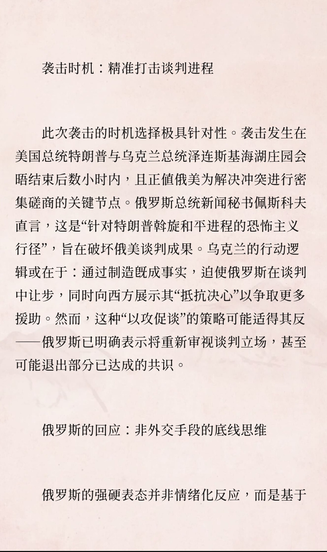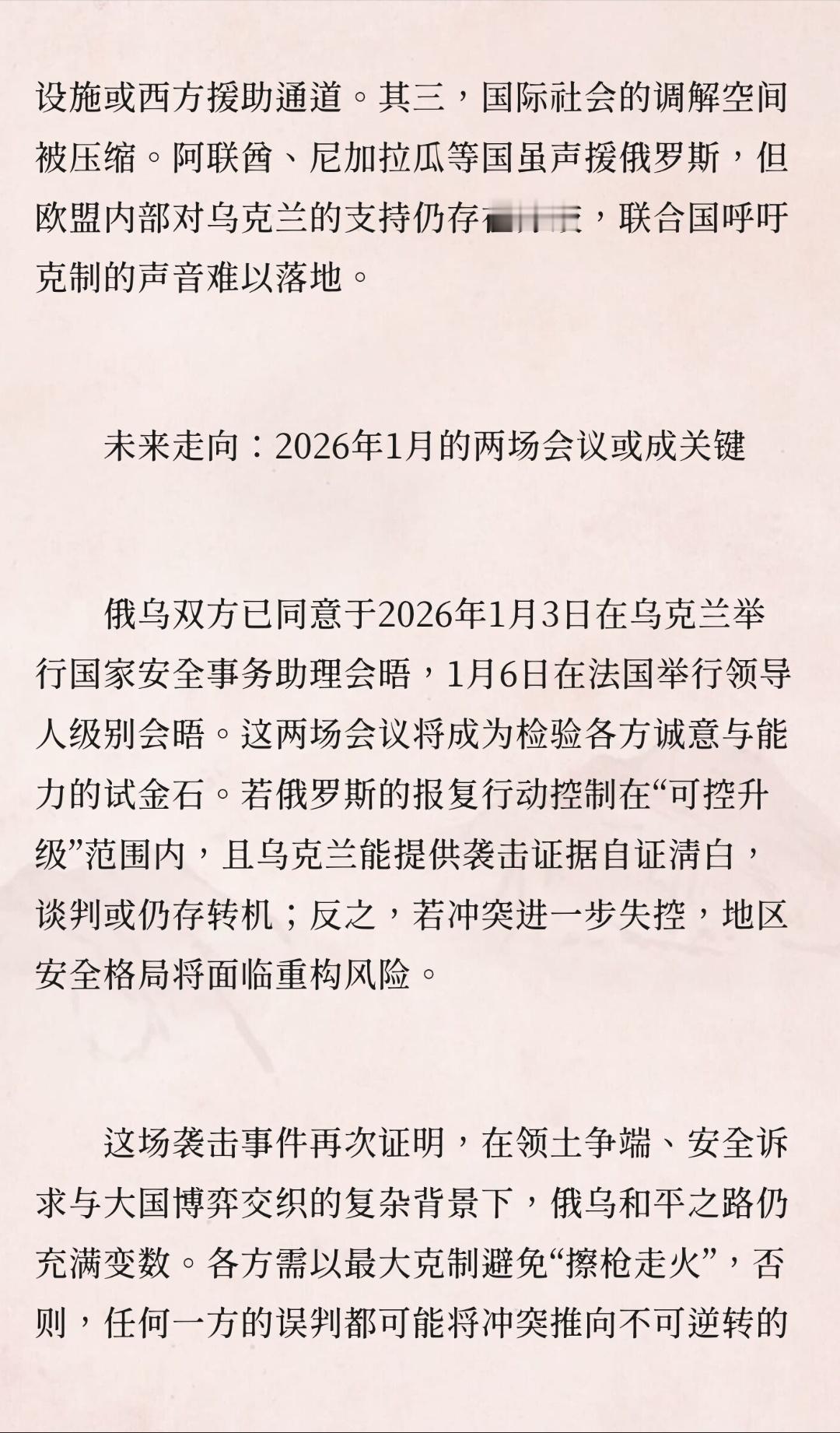 | 2025年12月29日凌晨,乌克兰使用91架无人机袭击俄罗斯总统普京位于诺夫哥罗德州的官邸,尽管俄防空部队成功拦截全部无人机,但这一事件仍成为俄乌冲突的重大转折点。俄罗斯外交部发言人扎哈罗娃明确表示“不会通过外交手段回应”,外长拉夫罗夫更宣布“已确定报复性打击目标和时间”。这场看似突发的袭击,实则暴露了俄乌双方在谈判僵局下的战略博弈,以及大国博弈对地区安全的深远影响。袭击发生在美国总统特朗普与乌克兰总统泽连斯基海湖庄园会晤结束后数小时内,且正值俄美为解决冲突进行密集磋商的关键节点。俄罗斯总统新闻秘书佩斯科夫直言,这是“针对特朗普斡旋和平进程的恐怖主义行径”,旨在破坏俄美谈判成果。乌克兰的行动逻辑或在于:通过制造既成事实,迫使俄罗斯在谈判中让步,同时向西方展示其“抵抗决心”以争取更多援助。然而,这种“以攻促谈”的策略可能适得其反——俄罗斯已明确表示将重新审视谈判立场,甚至可能退出部分已达成的共识。俄罗斯的强硬表态并非情绪化反应,而是基于多重战略考量。首先,普京官邸作为国家象征,其安全直接关联俄罗斯的国家尊严。若对此类袭击妥协,将削弱俄罗斯在冲突中的威慑力。其次,俄罗斯需向国内展示“强硬立场”以维持民意支持,尤其在战争进入第四年、经济承压的背景下。更重要的是,俄罗斯通过“非外交手段”的警告,试图重新掌握谈判主动权——既保留对话渠道,又以军事威慑迫使乌克兰回到理性轨道。拉夫罗夫强调“无意退出谈判”,但“调整立场”的表述,暗示俄罗斯可能提高要价,例如要求乌克兰承认更多领土现实,或限制西方军事援助。当前局势面临三大风险:其一,俄罗斯的报复性打击可能引发乌克兰进一步反击,形成“报复-反报复”的恶性循环。其二,美国态度成为关键变量。特朗普虽表达“震惊和愤怒”,但未完全切断与乌克兰的合作,仅强调“未提供战斧导弹”。若美国继续军援,俄罗斯可能扩大打击范围至乌克兰能源设施或西方援助通道。其三,国际社会的调解空间被压缩。阿联酋、尼加拉瓜等国虽声援俄罗斯,但欧盟内部对乌克兰的支持仍存在分歧,联合国呼吁克制的声音难以落地。俄乌双方已同意于2026年1月3日在乌克兰举行国家安全事务助理会晤,1月6日在法国举行领导人级别会晤。这两场会议将成为检验各方诚意与能力的试金石。若俄罗斯的报复行动控制在“可控升级”范围内,且乌克兰能提供袭击证据自证清白,谈判或仍存转机;反之,若冲突进一步失控,地区安全格局将面临重构风险。这场袭击事件再次证明,在领土争端、安全诉求与大国博弈交织的复杂背景下,俄乌和平之路仍充满变数。各方需以最大克制避免“擦枪走火”,否则,任何一方的误判都可能将冲突推向不可逆转的深渊。