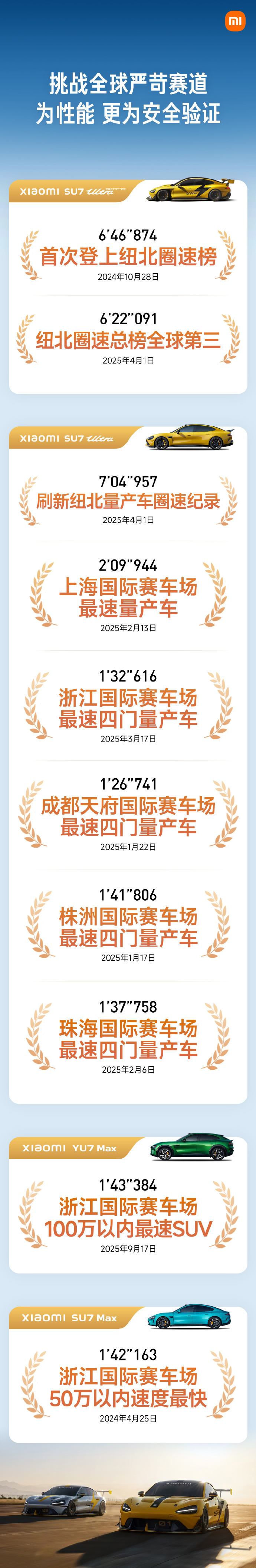小米SU7Ultra原型车于2025年4月1日以6分22秒091的成绩登上纽北圈速总榜全球第三,量产版则以7分04秒957刷新纽北量产车圈速纪录,并成为上赛、浙赛、成都天府国际赛车场、株洲国际赛车场、珠海国际赛车场等赛道最速四门量产车。
