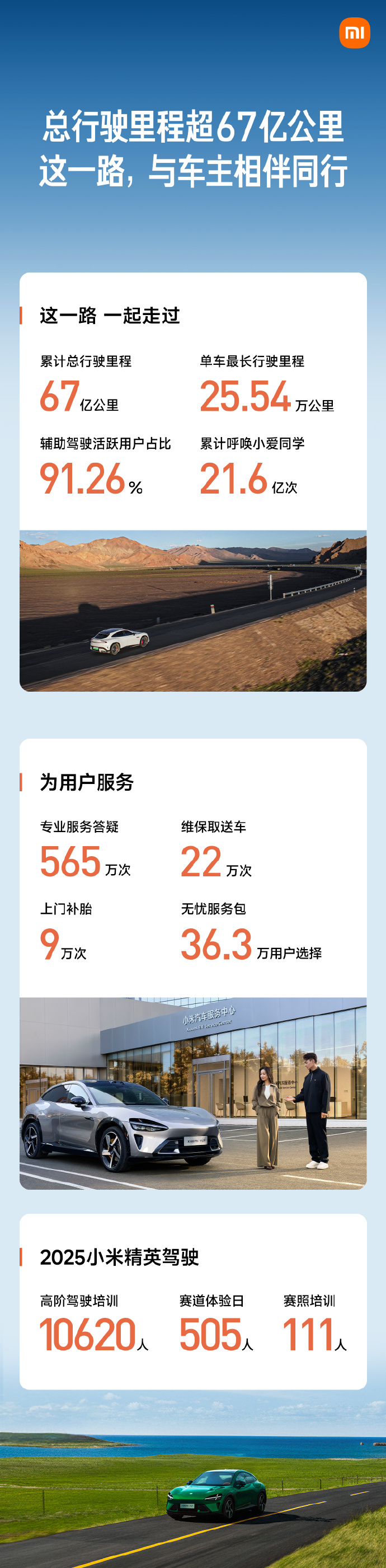 小米汽车总行驶里程超过67亿公里,其中单车最长行驶里程更是达到25.54万公里,辅助驾驶活跃用户占比91.26%,累计呼唤“小爱同学”21.6亿次。