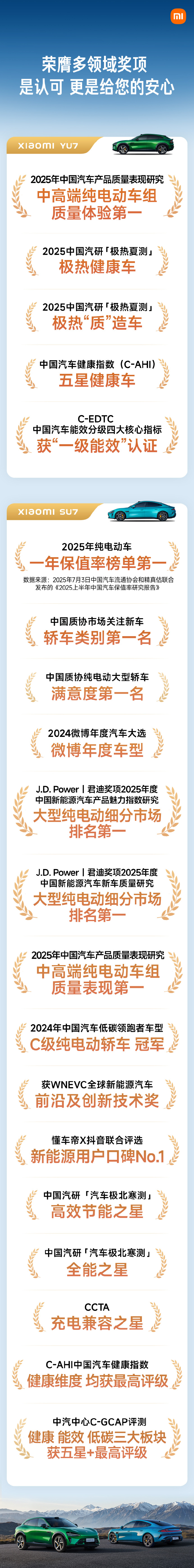 小米:SU 7成为年度20万元以上轿车累销第一,YU 7连续4个月中大型SUV销量第一