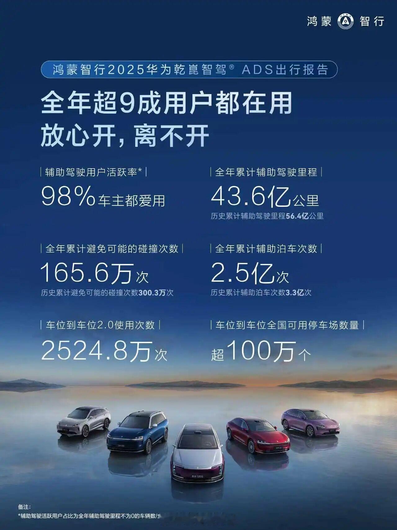 鸿蒙智行 发布2025年华为乾崑智驾出行报告了!1、辅助驾驶用户活跃率98%2、全年累计辅助驾驶里程43.6亿公里(总56.4亿公里)3、全年累计避免可能的碰撞次数165.6万次(总300.3万次)4、全年累计辅助泊车次数2.5亿次(总3.3亿次)5、车位到车位2.0使用次数2524.8万次6、车位到车位全国可用停车场数量超100万个对于这份鸿蒙智行关于ADS年度出行报告,大家怎么看?今年的辅助驾驶里程增长太快了,随着保有量的上升,明年应该也会在今年的基础上翻倍了汽场全开新能源汽车华为乾崑智驾在一起鸿蒙智行智慧出行体验智享车生活ADS伴我行鸿蒙智行