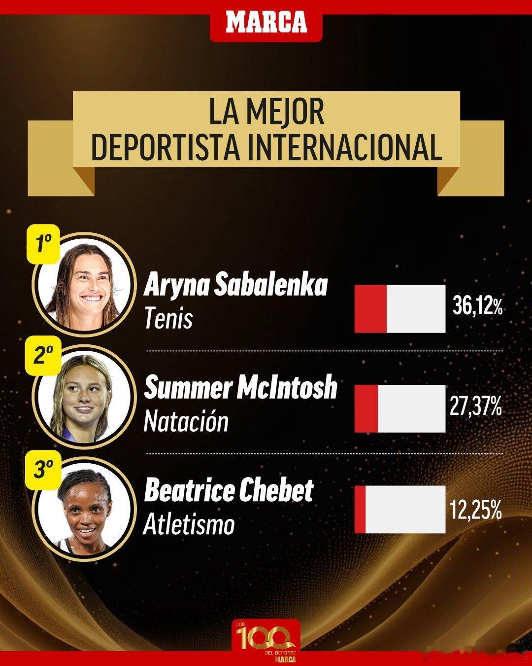 阿卡萨巴当选年度最佳!西班牙体育新闻权威媒体马卡报表彰了2025 年表现出色的运动员。阿尔卡拉斯被该媒体选为年度西班牙最佳运动员,领先Moto GP车手 Marc Marquez和攀岩运动员 Alberto Ginés。 在国际女子运动员类别中,萨巴伦卡当选年度最佳,她领先加拿大游泳运动员 Summer McIntosh 和肯亚田径运动员Beatrice Chebet。澳网2026