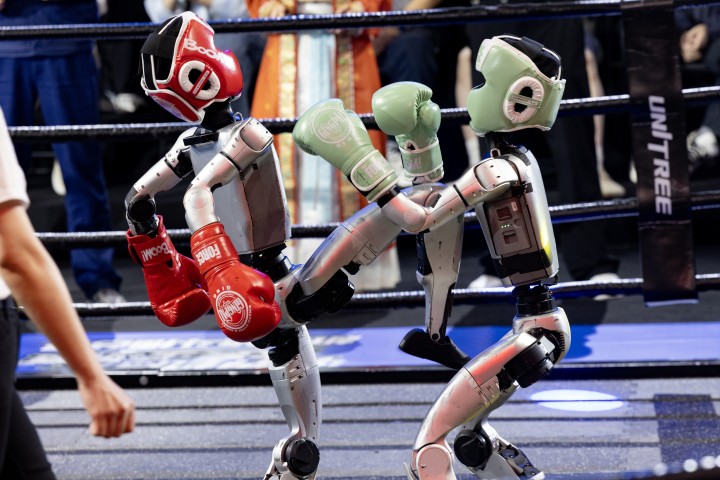 ▲5月25日,杭州,“CMG世界机器人大赛·系列赛”之机甲格斗擂台赛拉开帷幕。勾拳、侧踢、飞膝、组合拳……人形机器人第一次站上激烈又真实的拳台。也正是在这一天,宇树科技G1开始了全国“巡打”之旅。