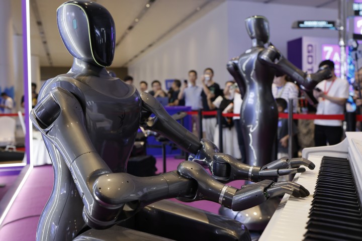 ▲9月25日,在第四届全球数字贸易博览会上,来自杭州的“和璇”机器人乐队演奏起《歌唱祖国》《沧海一声笑》《青花瓷》等曲目,吸足了眼球。教机器人弹琴,本质是训练它们手和臂的精细操作能力,为将来走进家庭、承担各类家务打下基础。