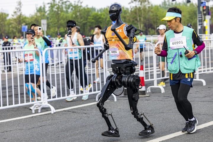 ▲4月19日,北京亦庄,全球首个人形机器人半程马拉松开跑。现场状况百出,有的脑袋和身体分家后还在顽强奔跑,有的在起跑线上就“躺平”了。最终,来自北京人形机器人创新中心的天工Ultra以2小时40分42秒的成绩,获得冠军。