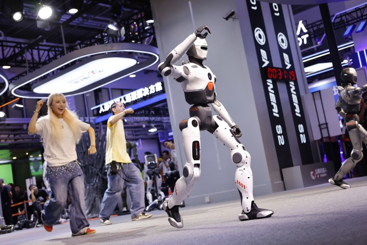 ▲8月8日,北京,来自众擎的人形机器人PM01以“斧头帮”舞蹈出圈,人类舞者成了它们的配角。