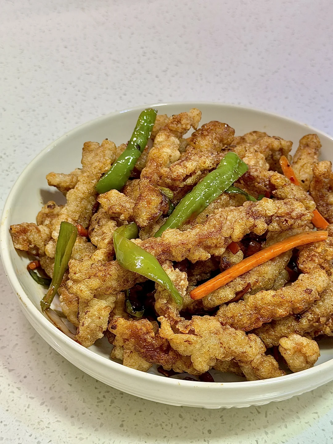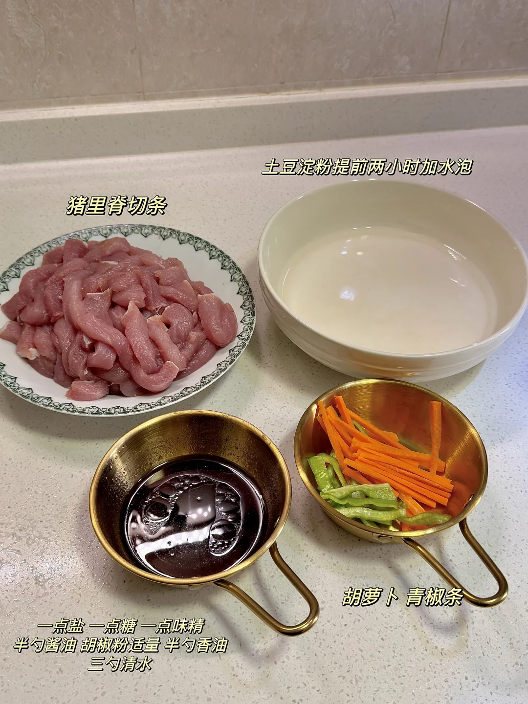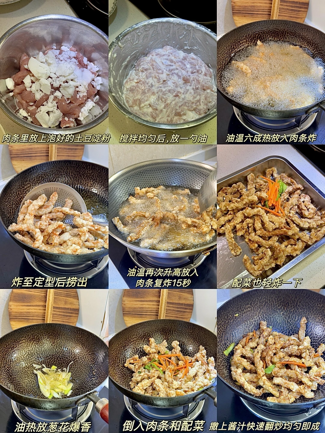 今日份美食分享: 焦烧肉条 . 食材:里脊肉 土豆淀粉 胡萝卜 青椒 酱汁(如图) 做法如图上⬆️ . 因为上次做的不太成功,今天又做了一次焦烧肉条 比上回的还好吃😋 焦烧肉条是咸口的肉条,锅包肉是甜酸口的肉片 溜肉段是咸口的肉块~ 还是有点区别的😂