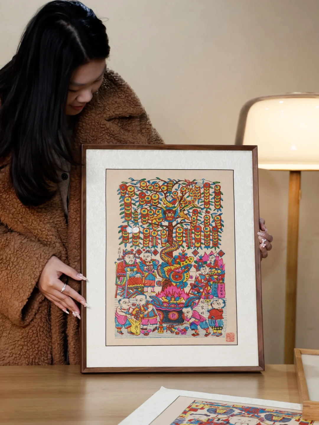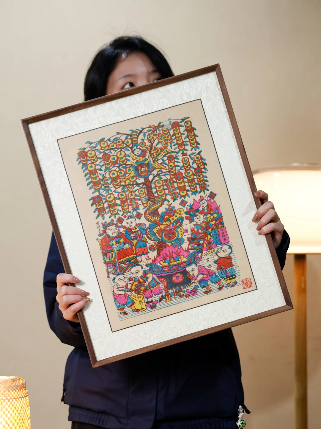 从被说俗气 再到火爆 年画终于被人看见!! 创造了老手艺的奇迹!! 这是杨乃东老师创作的「摇钱树」 它不是俗气的代表 每一个图案都是对来年的祝福 画面拙朴鲜艳 是现代艺术没有的古韵 以龙组成的摇钱树贯穿半个画面 下面有童子和聚宝盆组成 象征财运都汇集在家💰💰 我们特意为想装裱的朋友 选择了画框 拿到家就可以挂上 迎接新年🎉